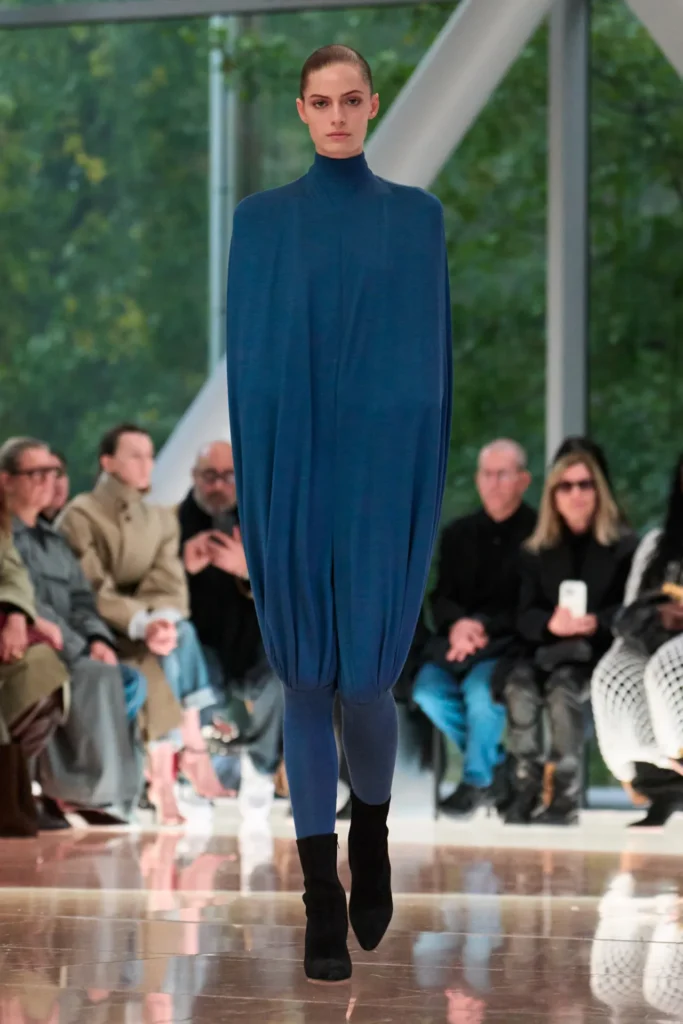 Though the silhouettes enveloped the body, desire pulsed beneath the surface. A flash of bare thigh between stockings and tunics, a glimpse of skin framed by the back cutout of a cocoon-like jacket, a pair of tight jeans visible through sheer panels — each gesture whispered rather than shouted. Even the grand gowns that closed the show revealed vulnerability through movement, their air-inflated shapes swaying with quiet drama.