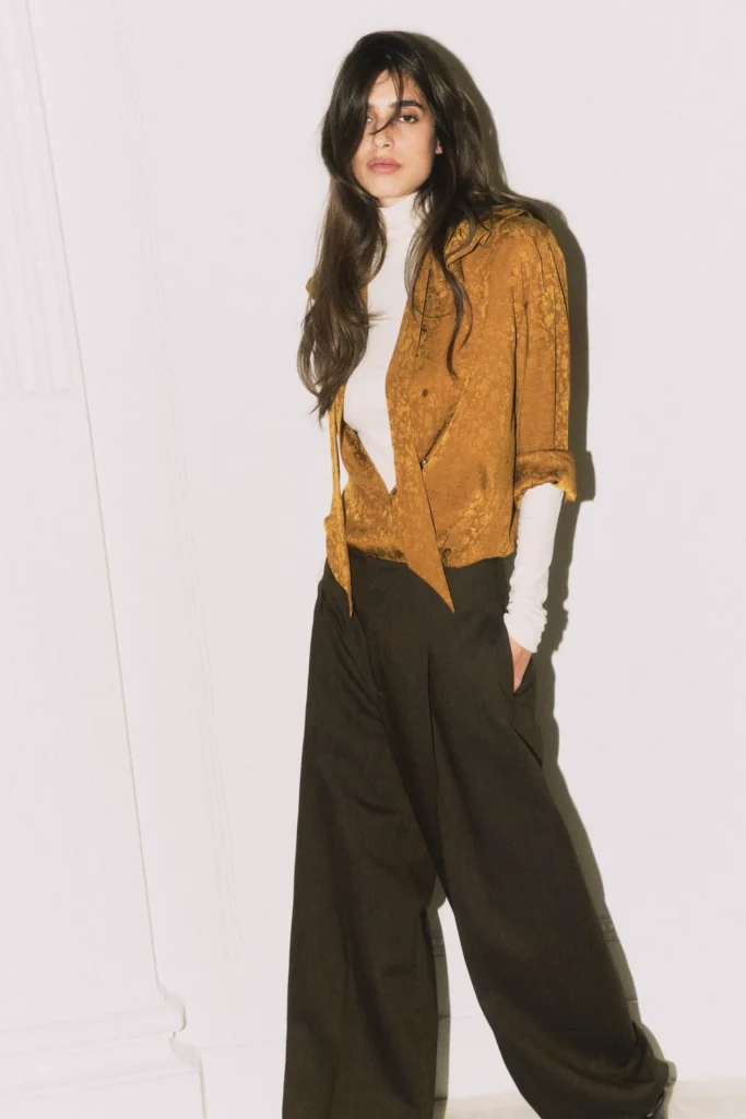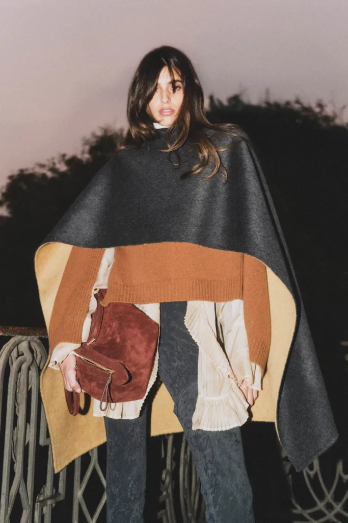 Outerwear anchors the collection: enveloping wool layers, blanket-like wraps, and reversible shearling coats emphasize warmth and soft architecture. Underneath, relaxed pajama sets in tropical wool and fluid satin signal the season’s ease and versatility, bridging day-to-night dressing with quiet confidence.