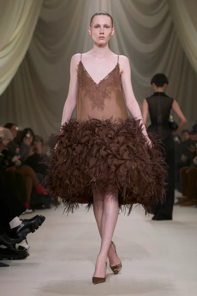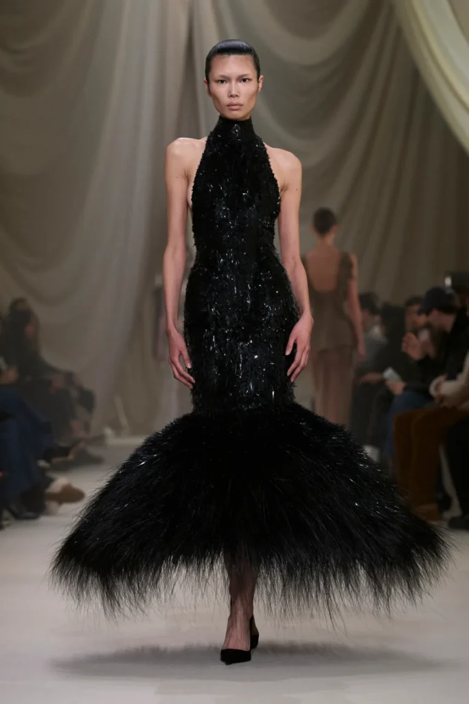 Black dominated, culminating in a sequined gown with a severe T-shaped back traced by tassels. Throughout the collection, backs were treated as focal points, adorned with bustles, pearl-encrusted trains, and elongated details that reinforced the sense of ceremony.