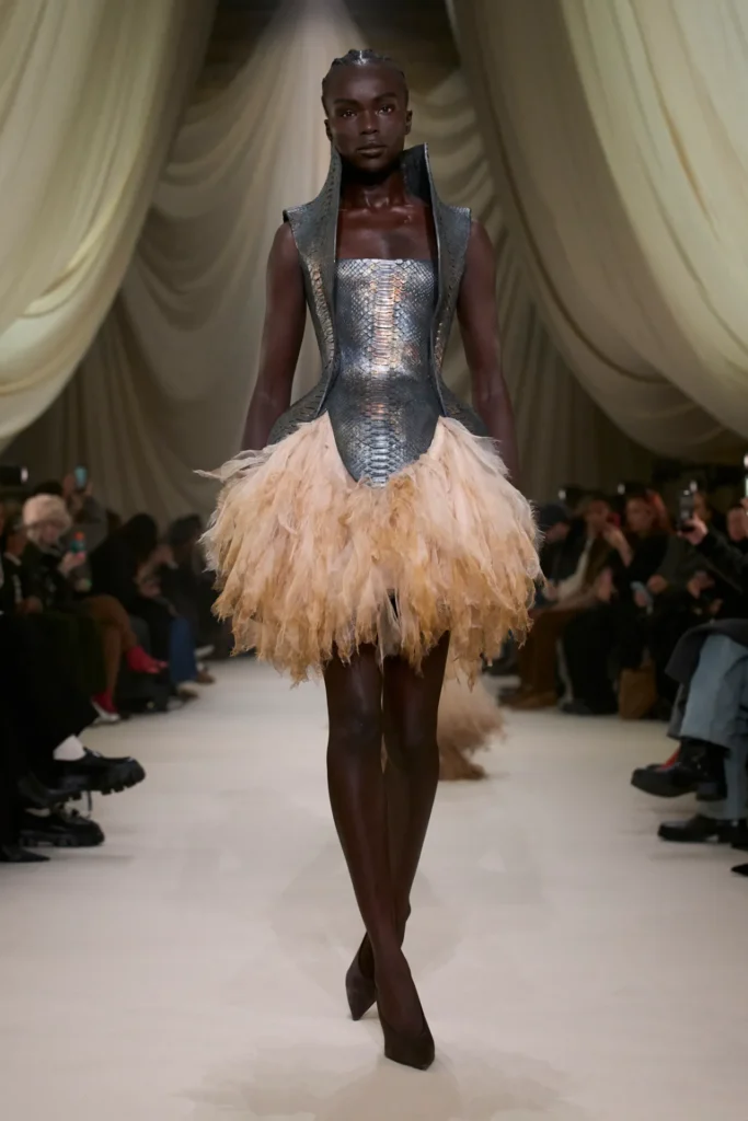Corsetry formed the backbone of the collection. Constructed using 18th-century techniques, tightly cinched bodices sculpted dramatic bell-shaped silhouettes, with hips emphasized through rounded peplums and shell-like volumes. The effect was unapologetically feminine, disciplined yet charged with tension.