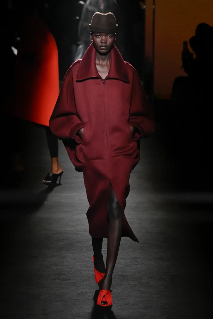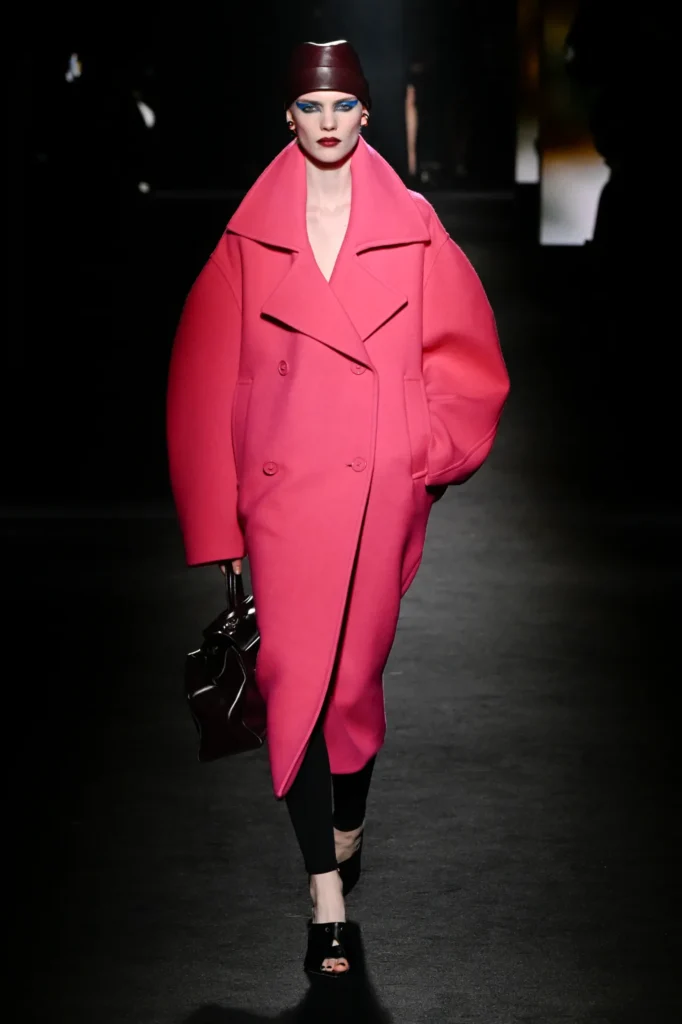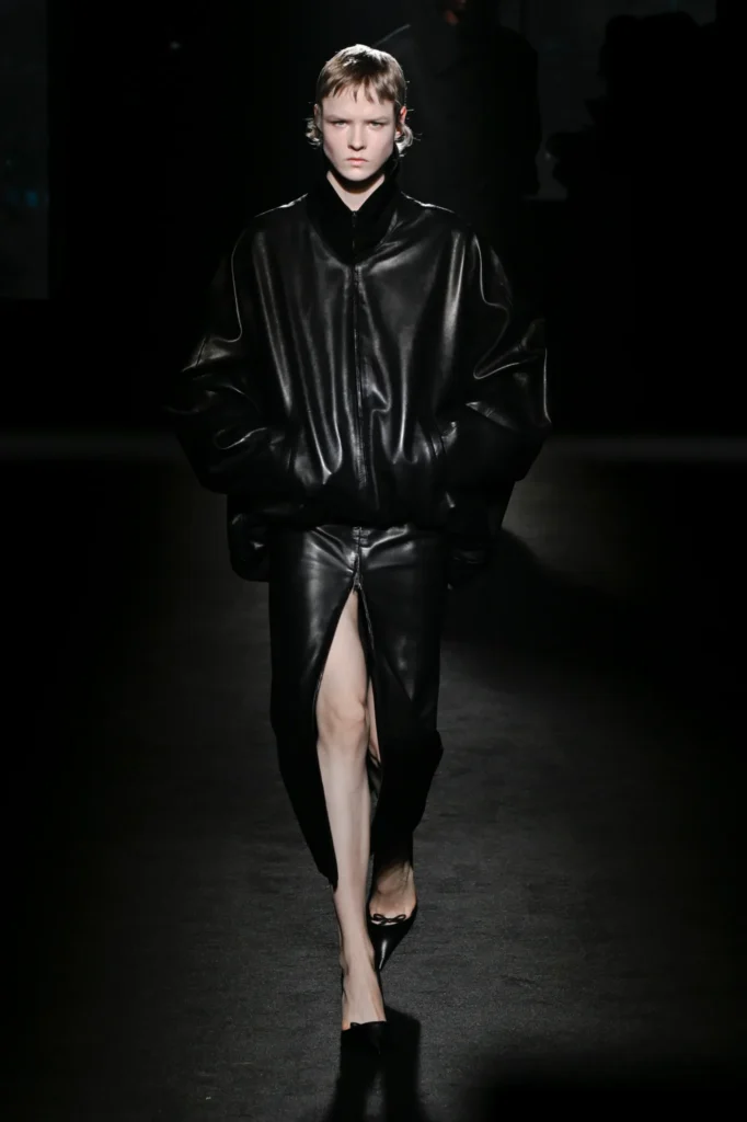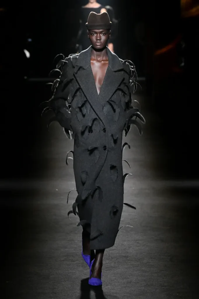On the runway, 81 models emerged one by one under narrow beams of light, each look anchored by a commanding coat. Many silhouettes featured rounded, cocoon-like backs—a modern interpretation of the sculptural forms pioneered by founder Cristóbal Balenciaga.