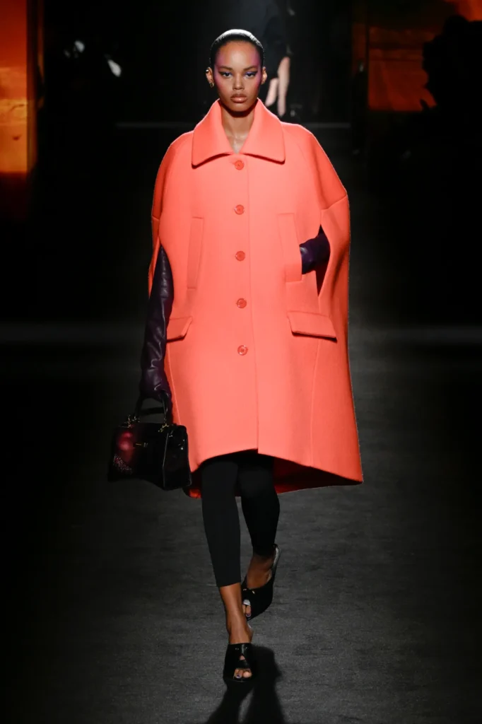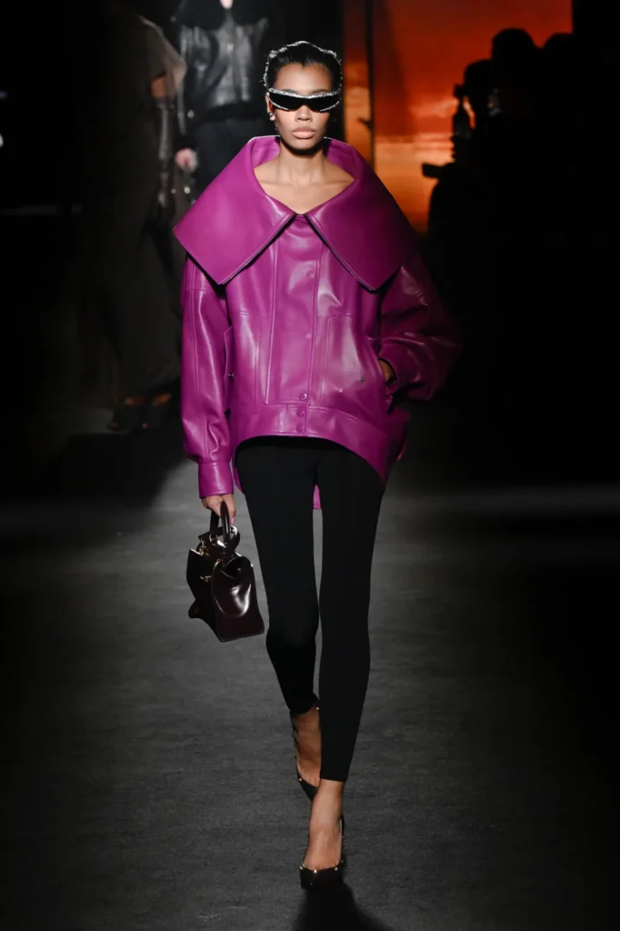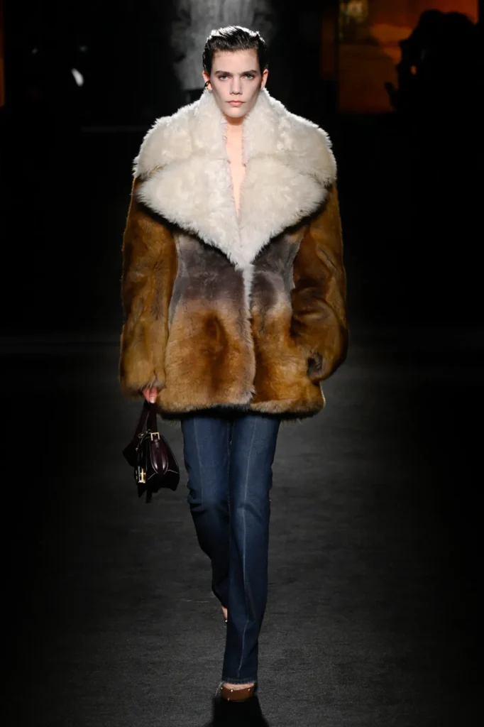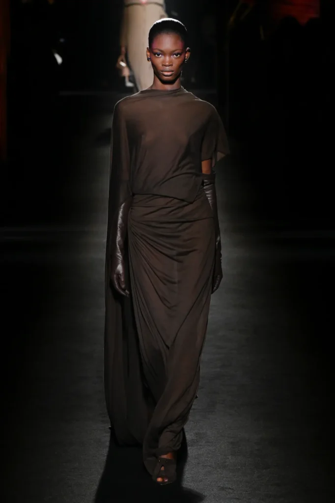 Between these outerwear statements, Piccioli introduced fluid jersey dresses—technical feats of draping with almost invisible seams—alongside sharply cut high-waisted denim that grounded the collection in everyday wear.