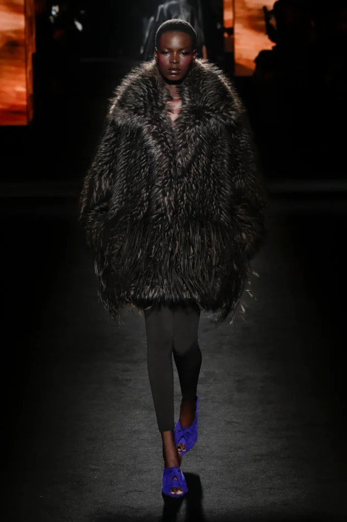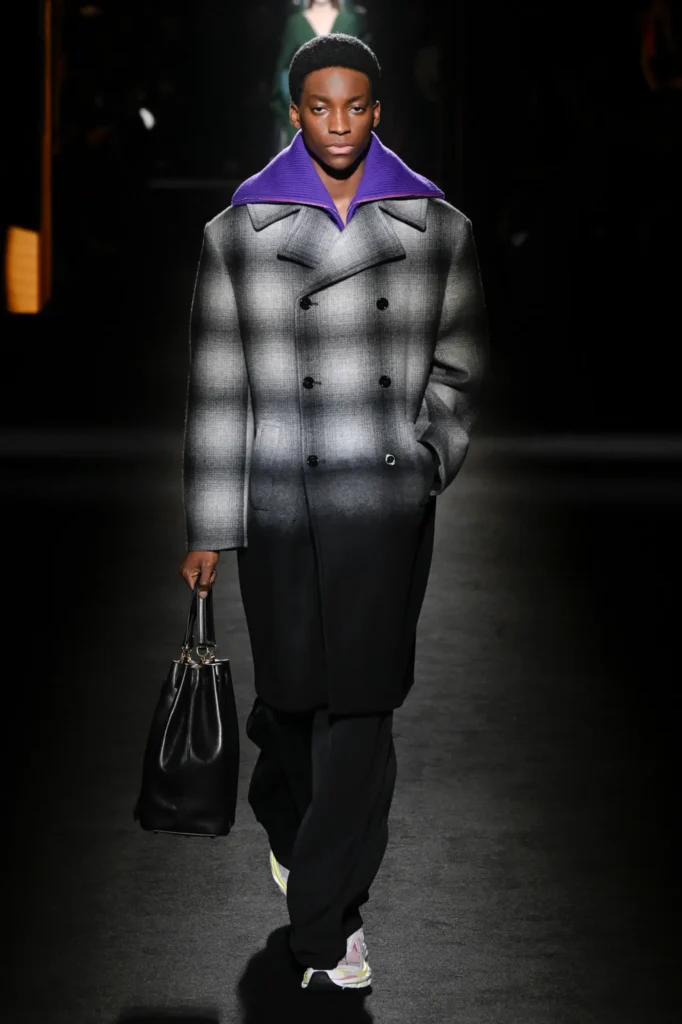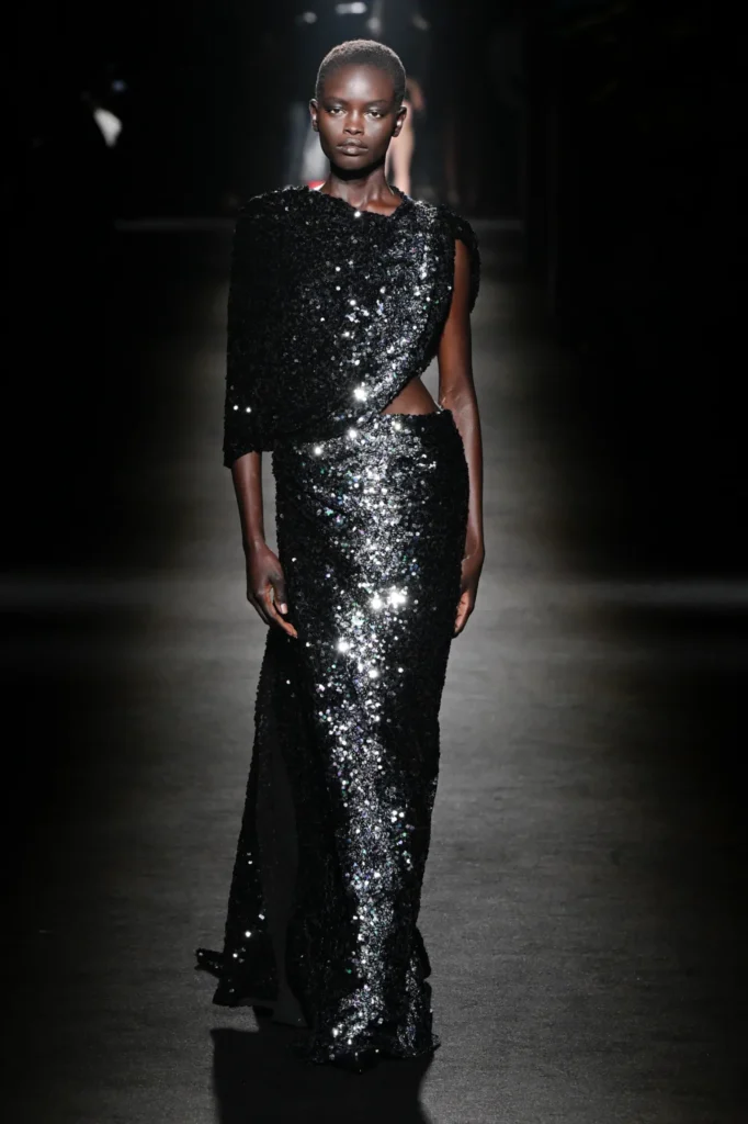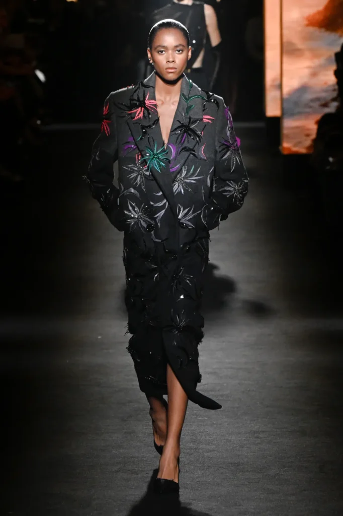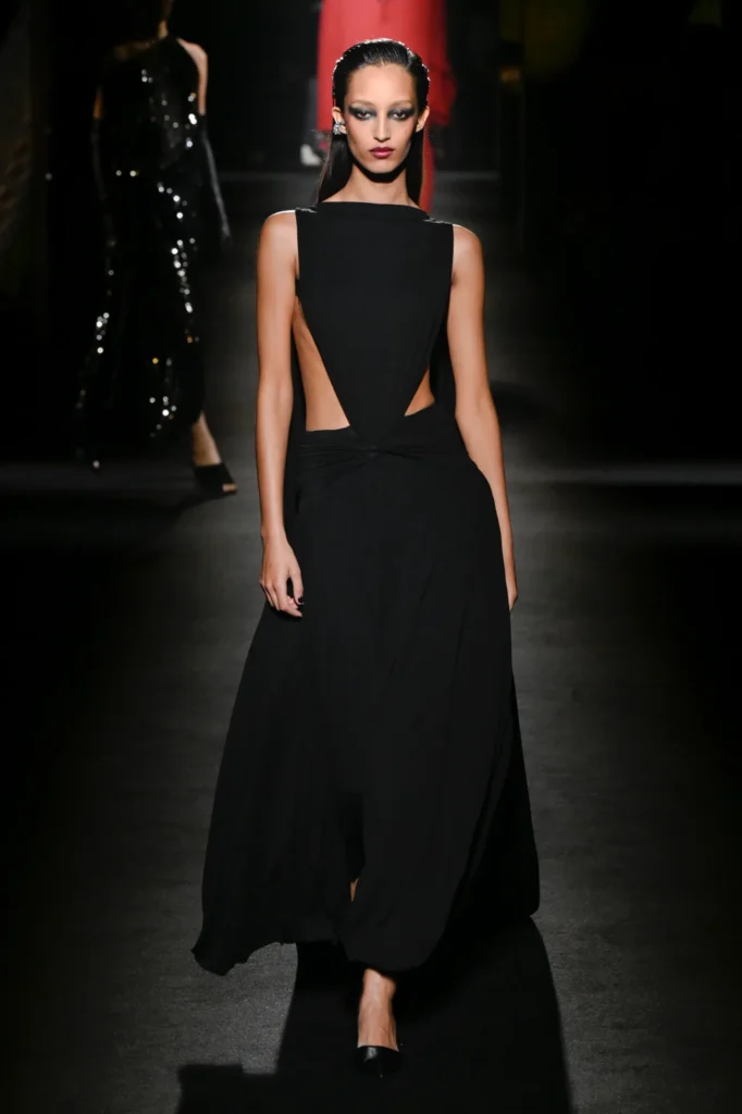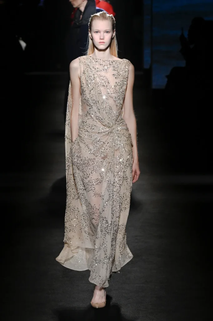 The show unfolded in a darkened space along the Champs-Élysées, inside a former flagship store by Adidas. Piccioli collaborated with Sam Levinson, whose visual installation filled the venue with flickering monitors showing California landscapes, empty bars, wolves, and fragments featuring cast members from Euphoria, including Danielle Deadwyler. The imagery echoed the designer’s fascination with contemporary youth culture.