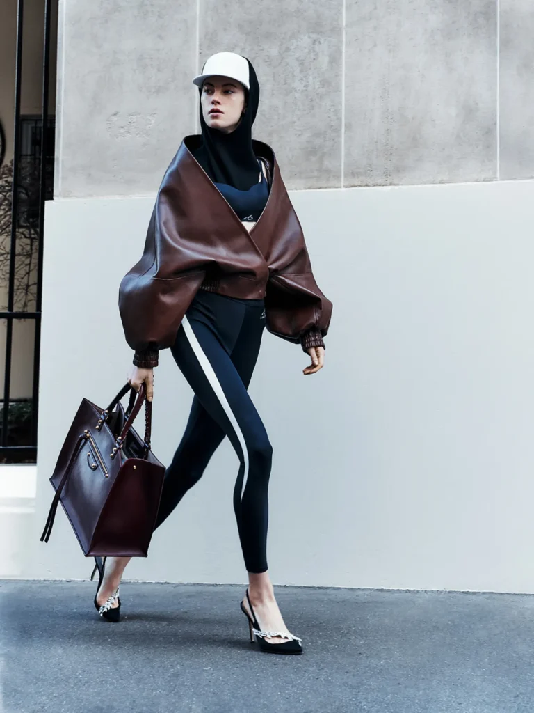 Shot across Paris streets, the métro, and a sleek apartment outfitted with gym equipment, the lookbook reinforces Piccioli’s thesis: fashion should move with the body. Technical pieces—leggings, cropped tops, and streamlined bodysuits—are crafted from high-performance, moisture-wicking, antibacterial fabrics, some even finished with sequins resilient enough for yoga or a long run. A leather jacket is treated like a windbreaker; footwear follows suit, from a flexible ballet-style sneaker with a rubber sole to men’s loafers lined in Lycra for athletic comfort.