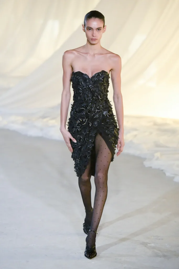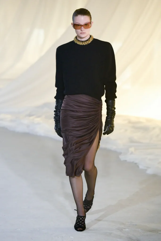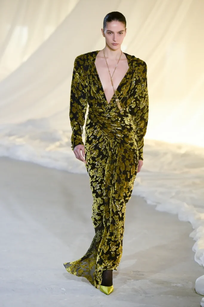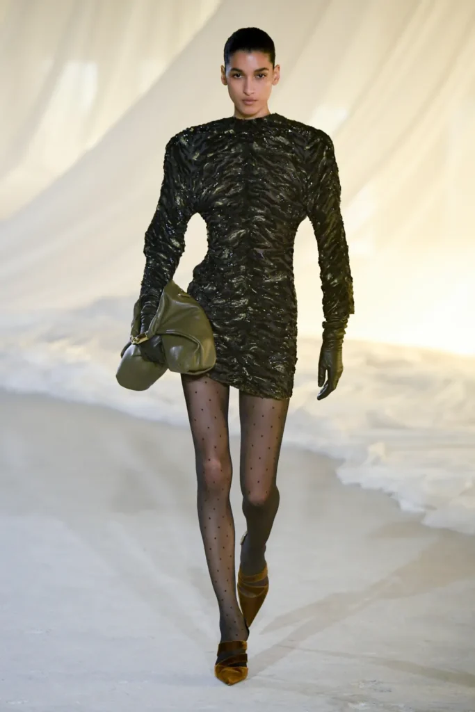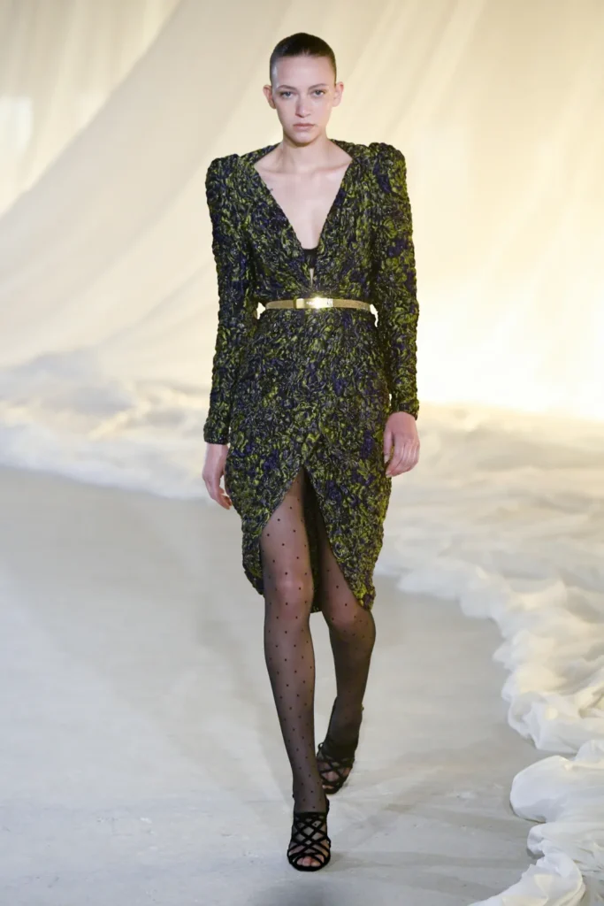 Gold was present, but restrained. Military inflections surfaced in structured shoulders and hardware, yet without excess. Dense embellishment appeared in measured doses, offset by Tron’s command of drape and cut. Cocktail and evening dresses nodded to the 1980s with sculpted lines, alternating between sharp authority and fluid ease.