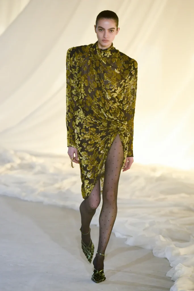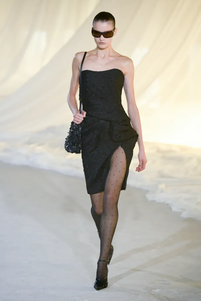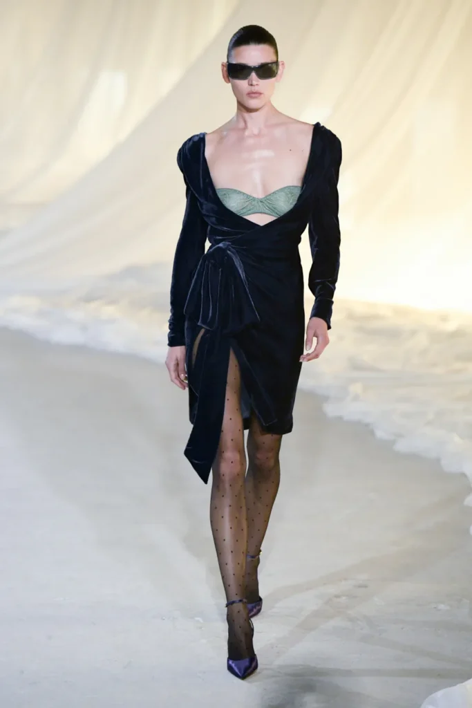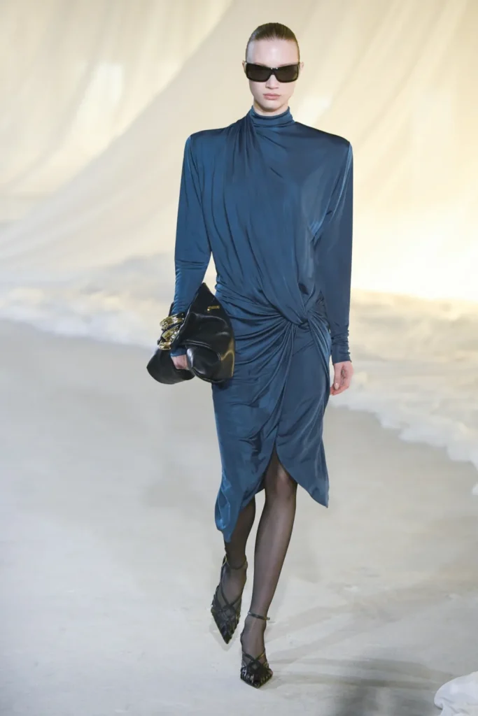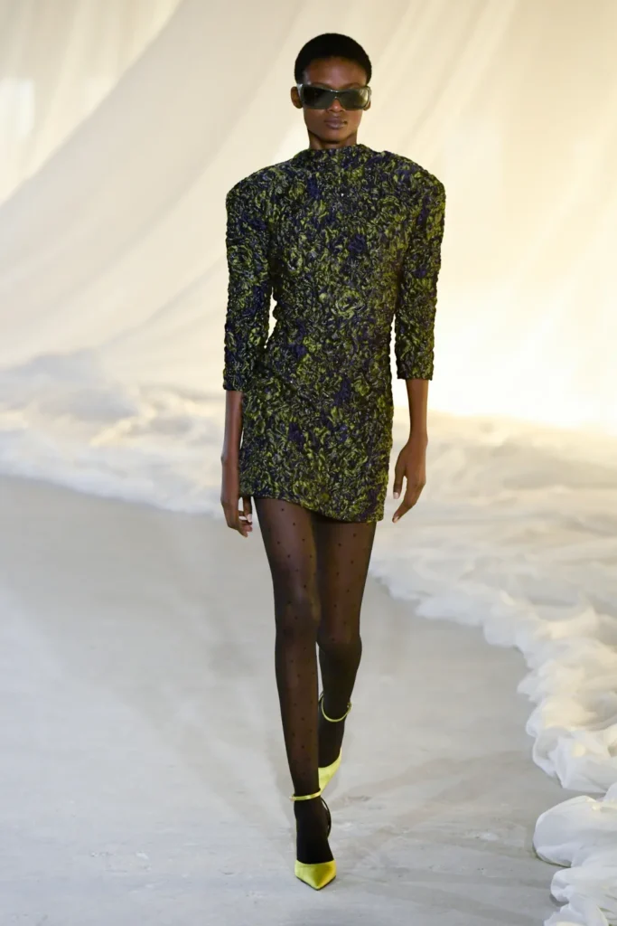 Gold was present, but restrained. Military inflections surfaced in structured shoulders and hardware, yet without excess. Dense embellishment appeared in measured doses, offset by Tron’s command of drape and cut. Cocktail and evening dresses nodded to the 1980s with sculpted lines, alternating between sharp authority and fluid ease.