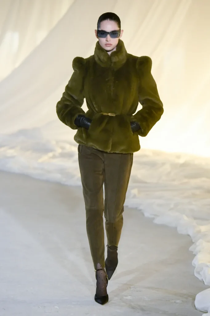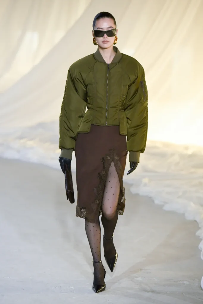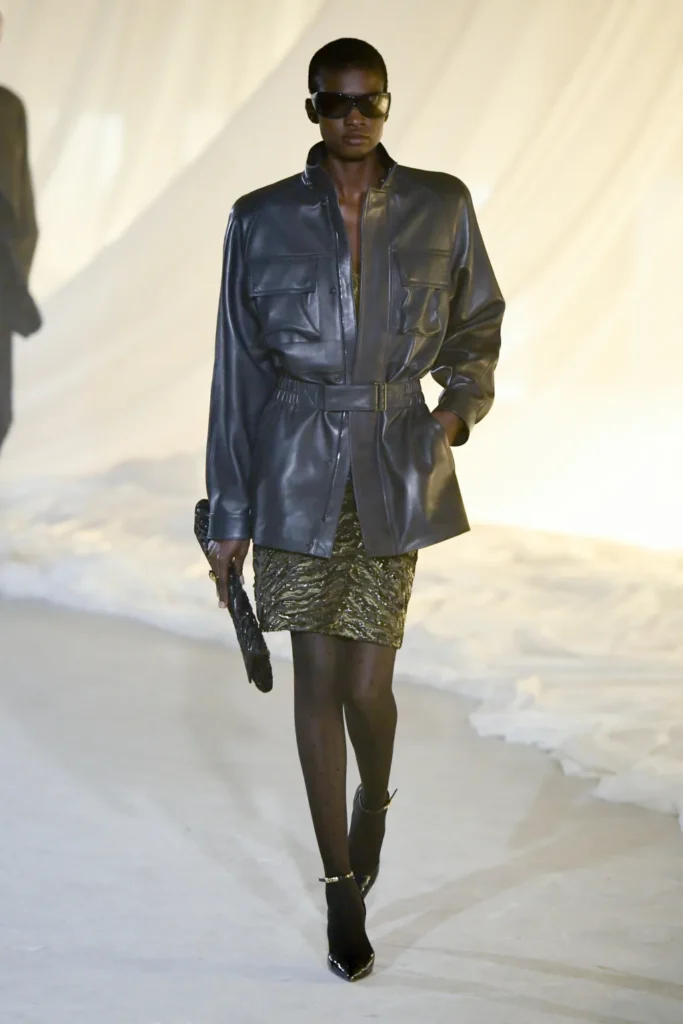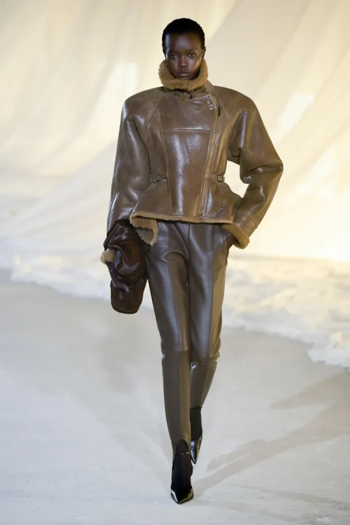 Cinematic references sharpened the mood. The atmosphere evoked the sultry menace of The Hunger and the surreal tension of Mulholland Drive, with a trace of dystopian gloss reminiscent of Blade Runner. On the runway, glossy leather aviator jackets with Joan Crawford shoulders became emblems of this streamlined vision—strong, aerodynamic, unapologetic. Wraparound sunglasses, leather trousers, and bomber jackets cinched at the waist with peplum flares reinforced a sense of velocity.