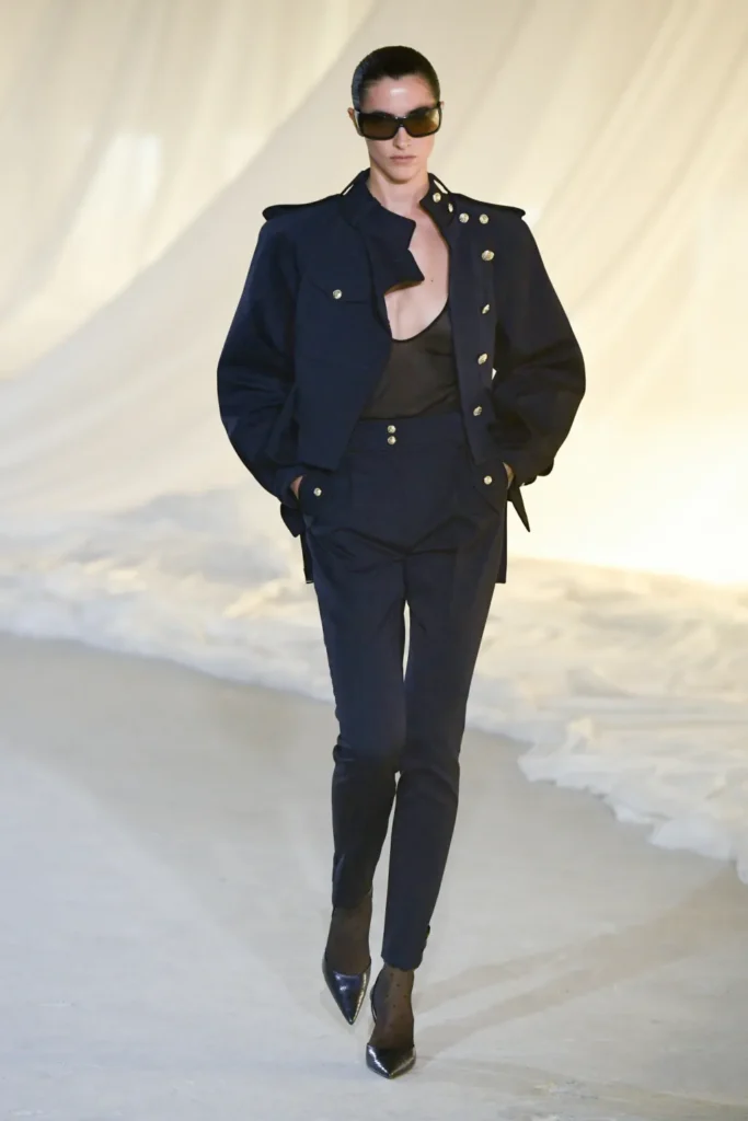Tron approached the house archives with precision, zeroing in on Pierre Balmain’s formative postwar years, particularly the severe elegance of Spring 1946. That tension—sobriety charged with erotic undercurrent—became the collection’s backbone. The result was a debut that felt assured rather than explosive: a recalibration of Balmain codes through a darker, more pragmatic lens.