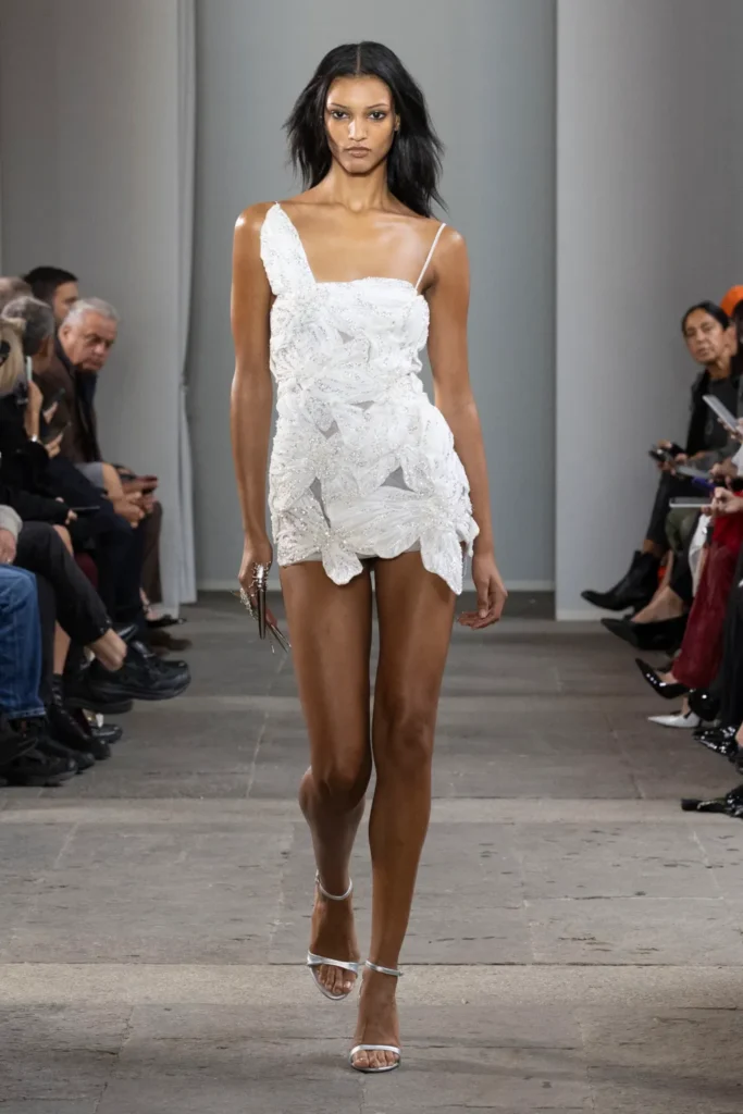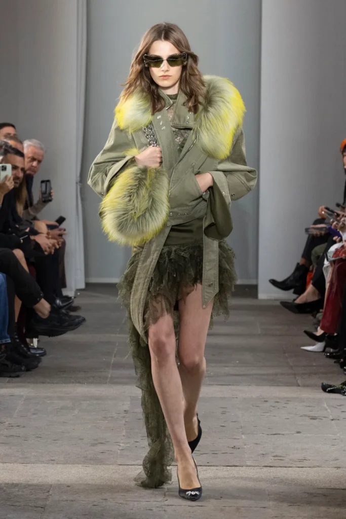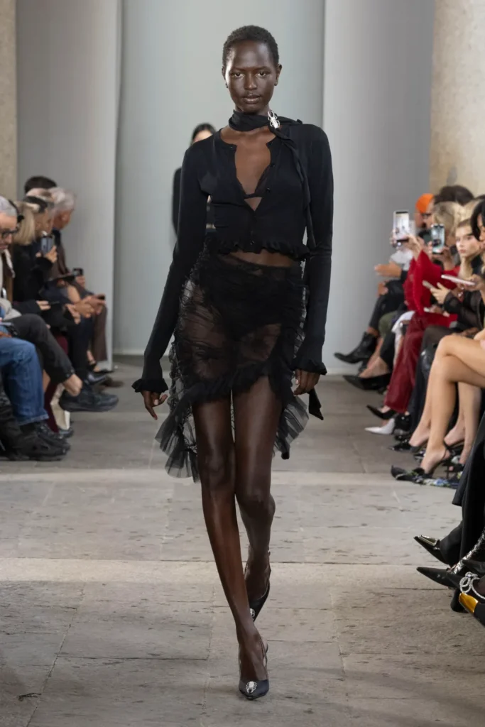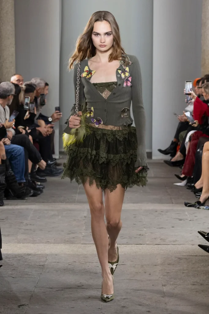 The palette underscored this tension: delicate nude and blush shades collided with inky blacks and flashes of acid green. Highlights included ruched mini dresses with a coquettish spirit, airy gowns covered in butterfly motifs reinterpreted as feline spots, and cascades of ruffles paired with lace appliqués that amplified the visual drama.
