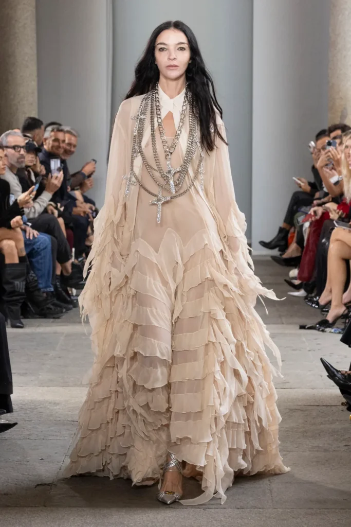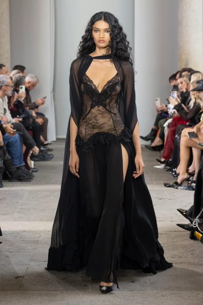 For his sophomore outing at Blumarine, David Koma pushed the brand firmly into the realm of nocturnal seduction. More than just a runway show, it was an exploration of dark romanticism, where gothic literature and passionate love stories were reimagined for a summer context with both audacity and refinement.