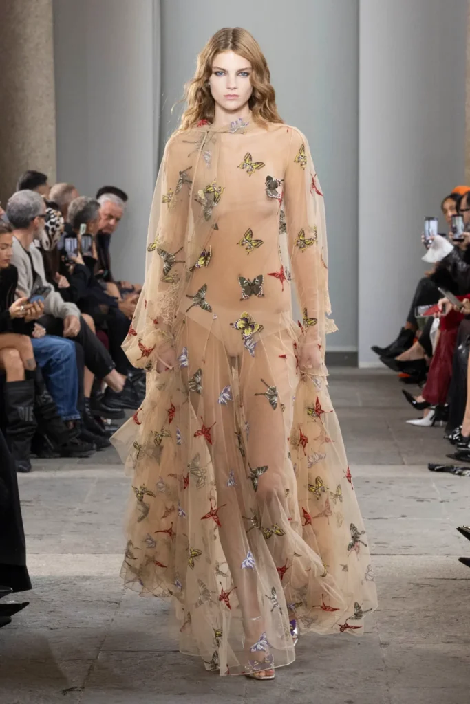 The butterfly, long a symbol of the house, met its alter ego—the dragonfly—in a dialogue of contrasts that became the central narrative of the collection. They surfaced as prints, embroidery, appliqués, and even bold statement jewelry. Oppositions extended into the silhouettes: sharp, tailored blazers were softened with georgette panels, while ethereal gowns in tulle and transparent georgette drifted alongside precise tailoring.