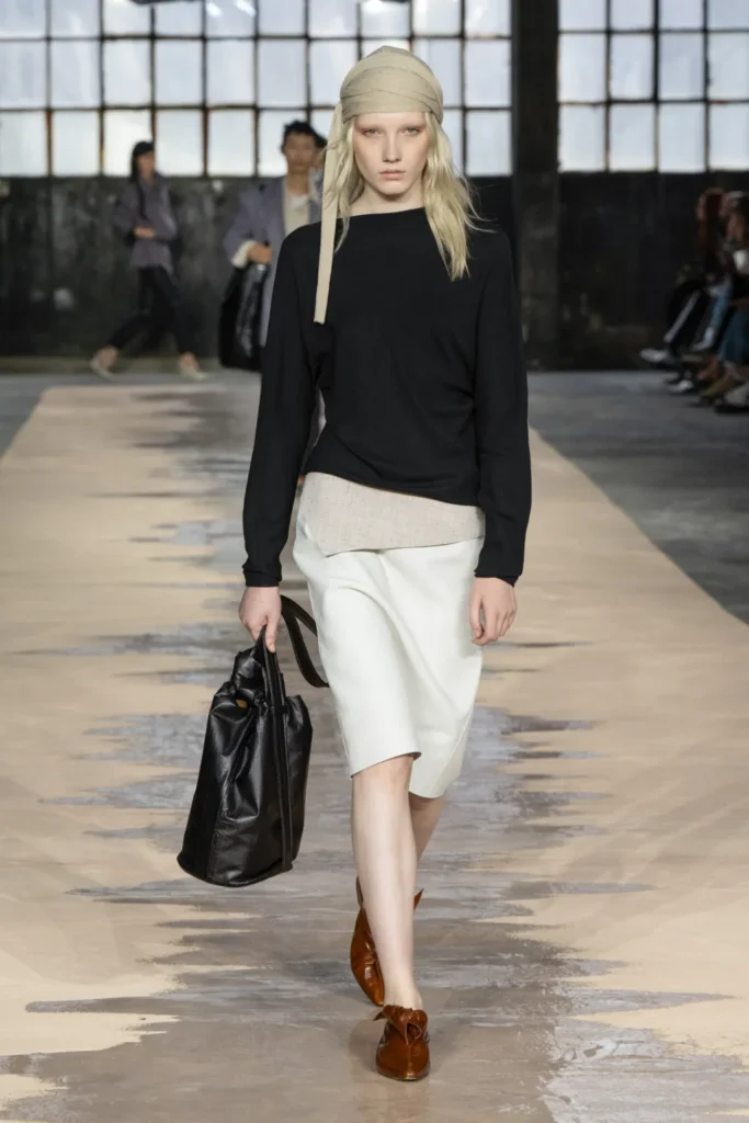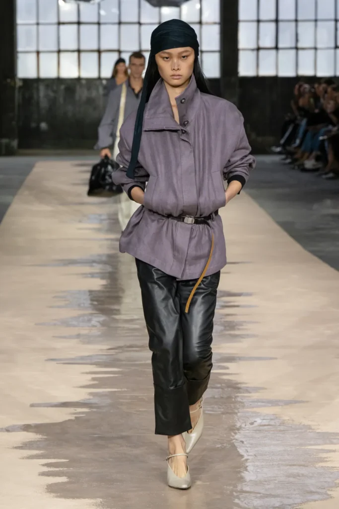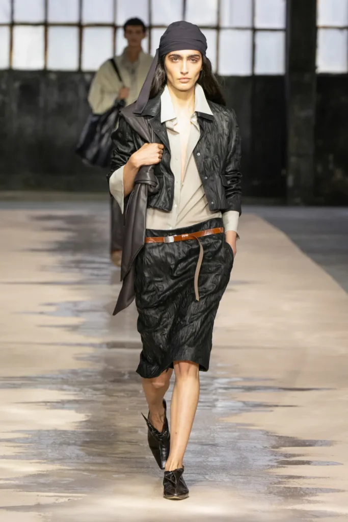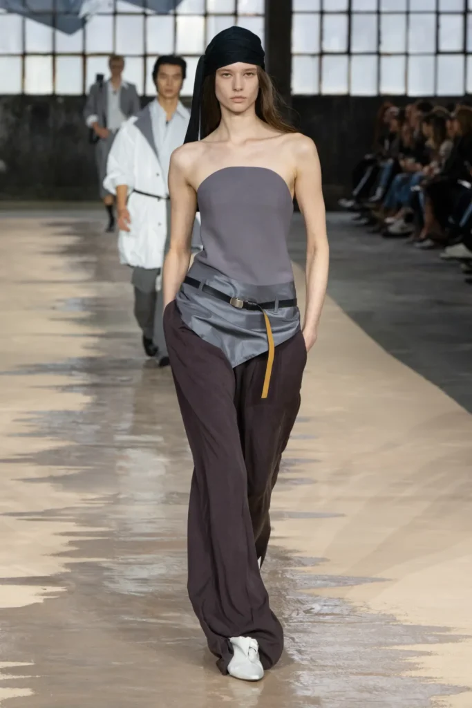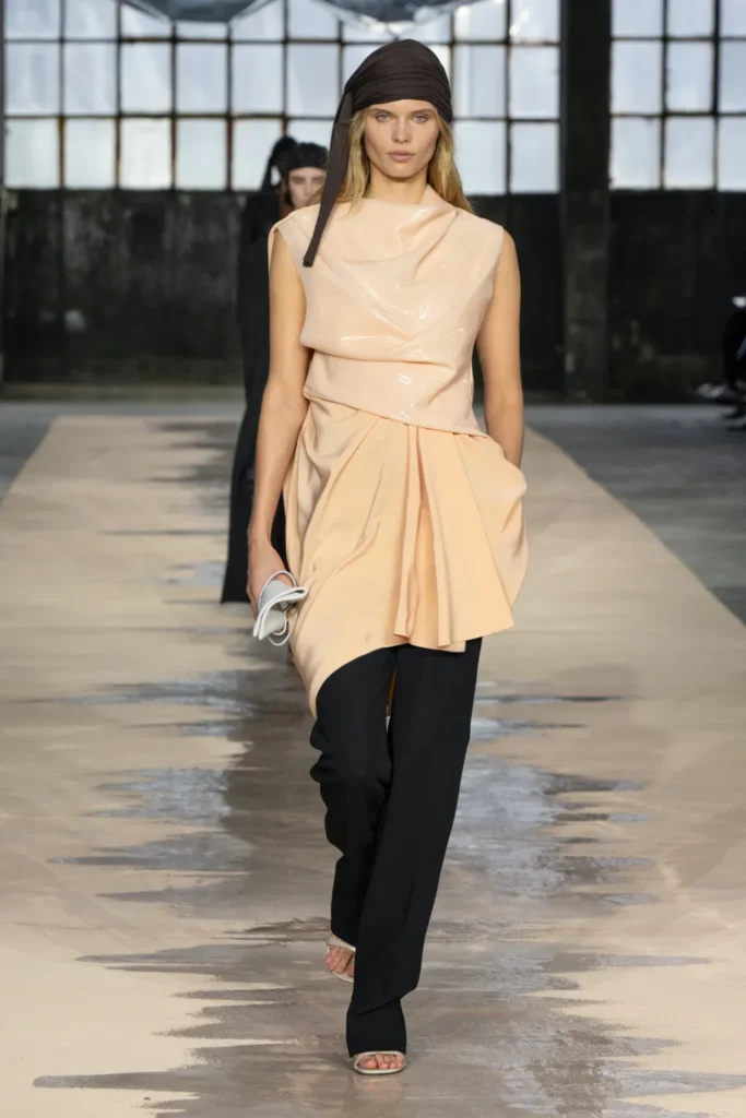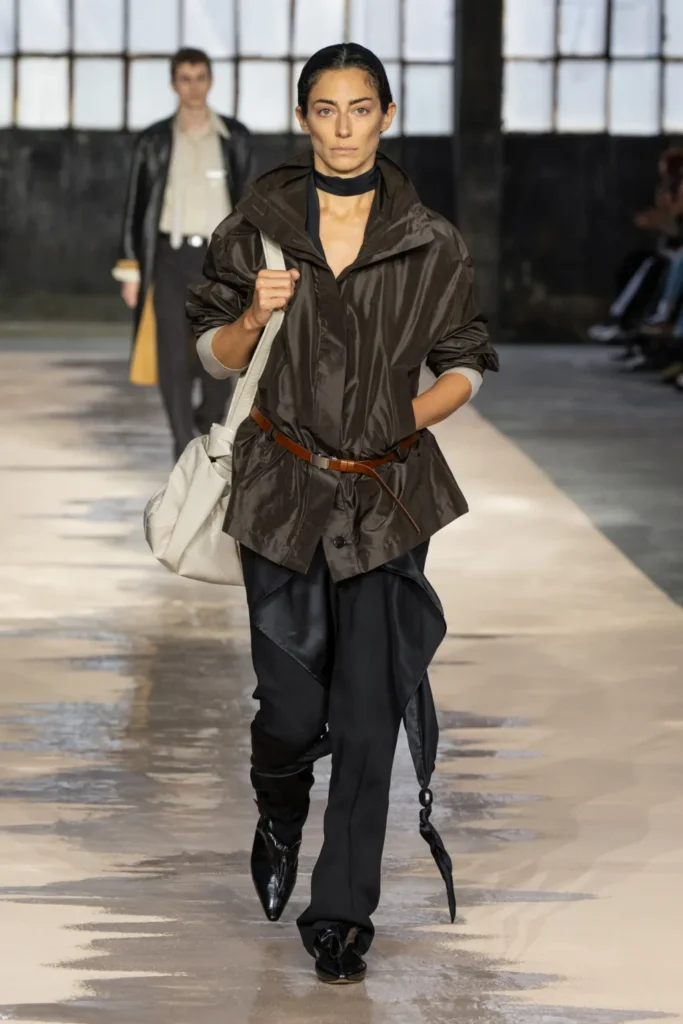 A striking scenographic element enhanced the show’s narrative: a ribbon of shiny fabric suspended above the runway swayed in a carefully choreographed motion, reflecting the controlled chaos and vibrant energy embedded in the collection.