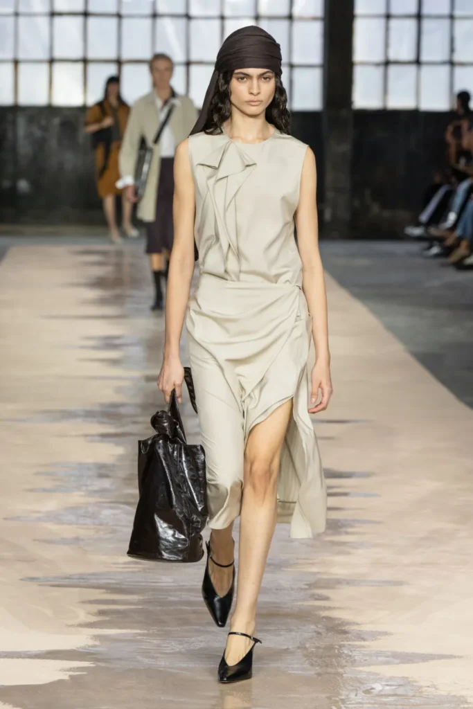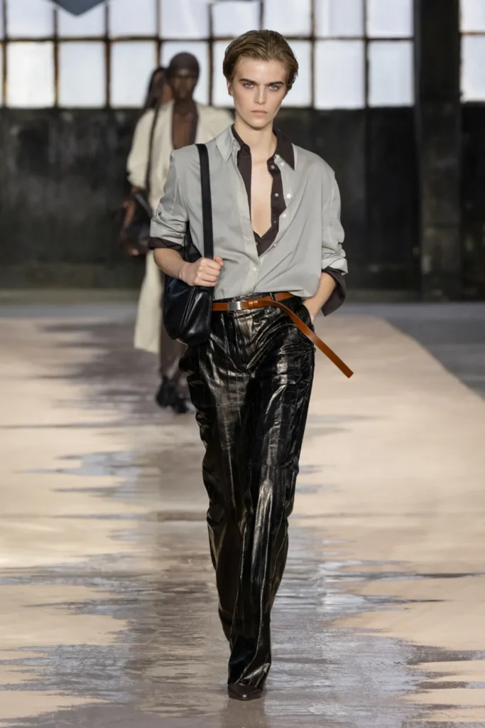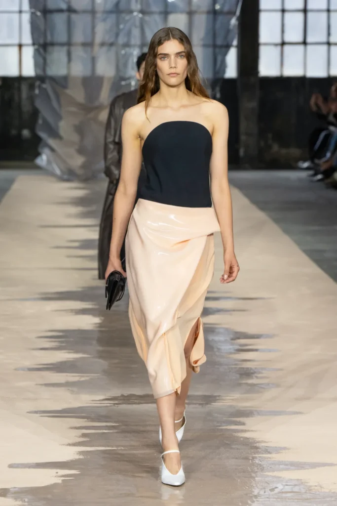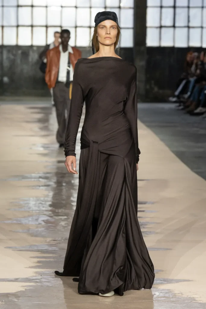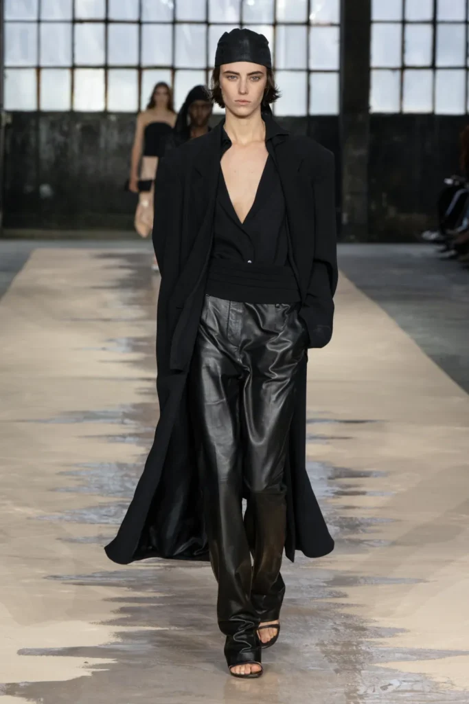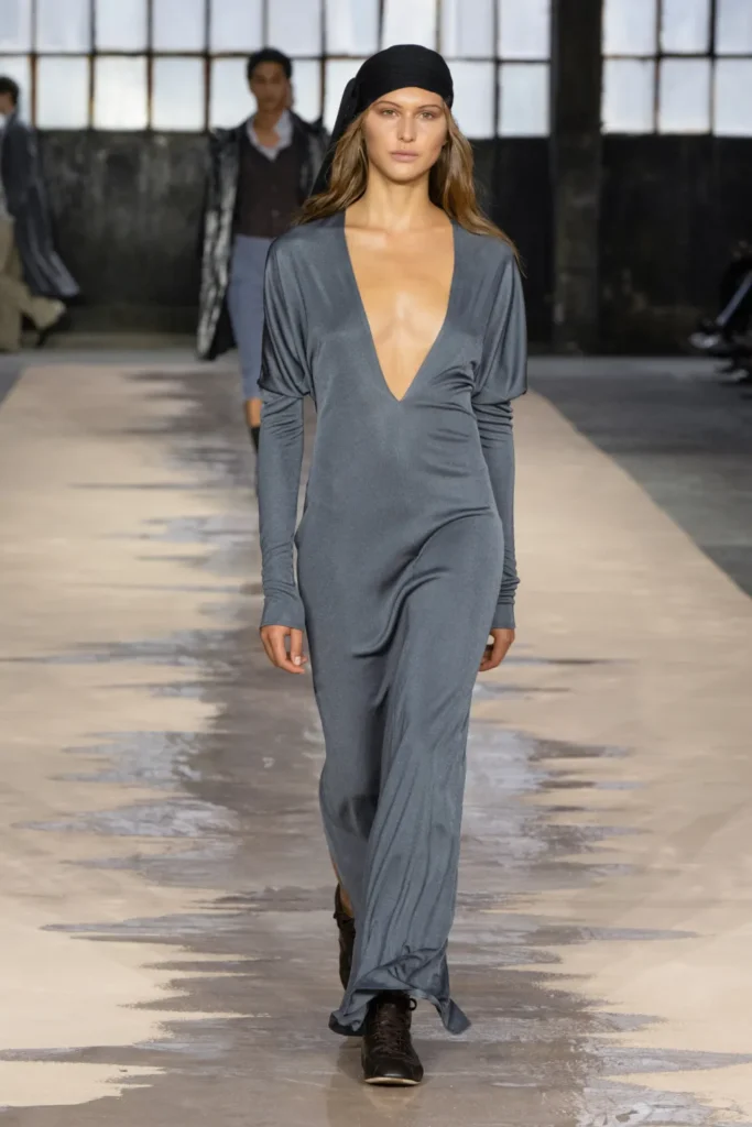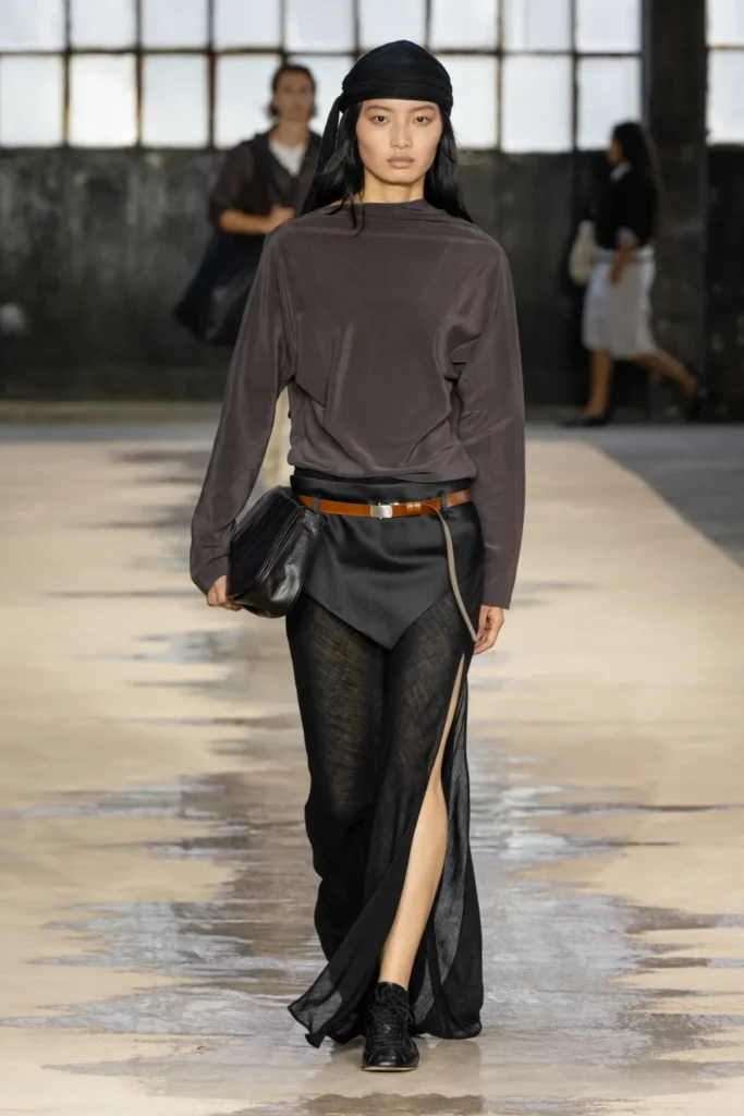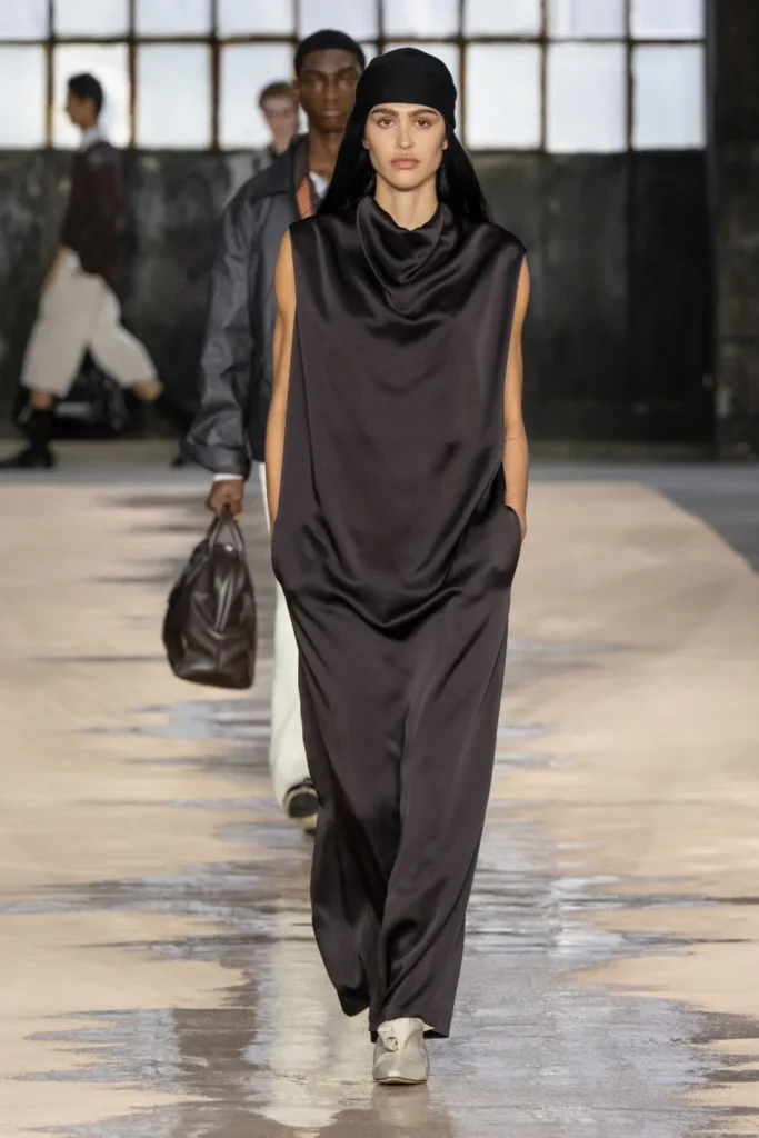 Standout moments included Amelia Grey walking in an ankle-length sack dress with a plunging V-back, and S.Coups, K-pop sensation and member of Seventeen, closing the show in a wide, camel-colored trench crafted from flexible leather. The lineup also featured glossy short coats, bias-cut jersey tops, and functional yet chic details such as welt pockets on sleek dresses, merging practicality with understated elegance.