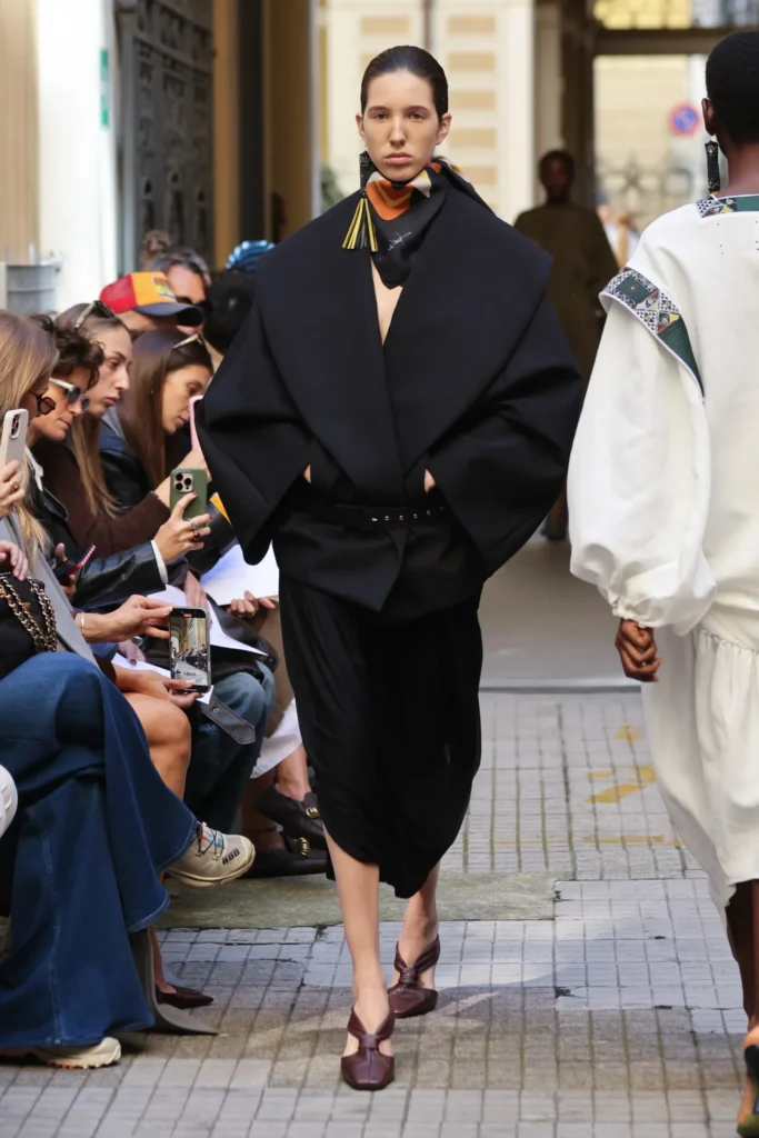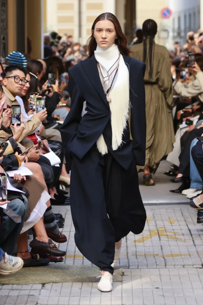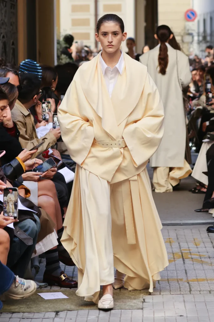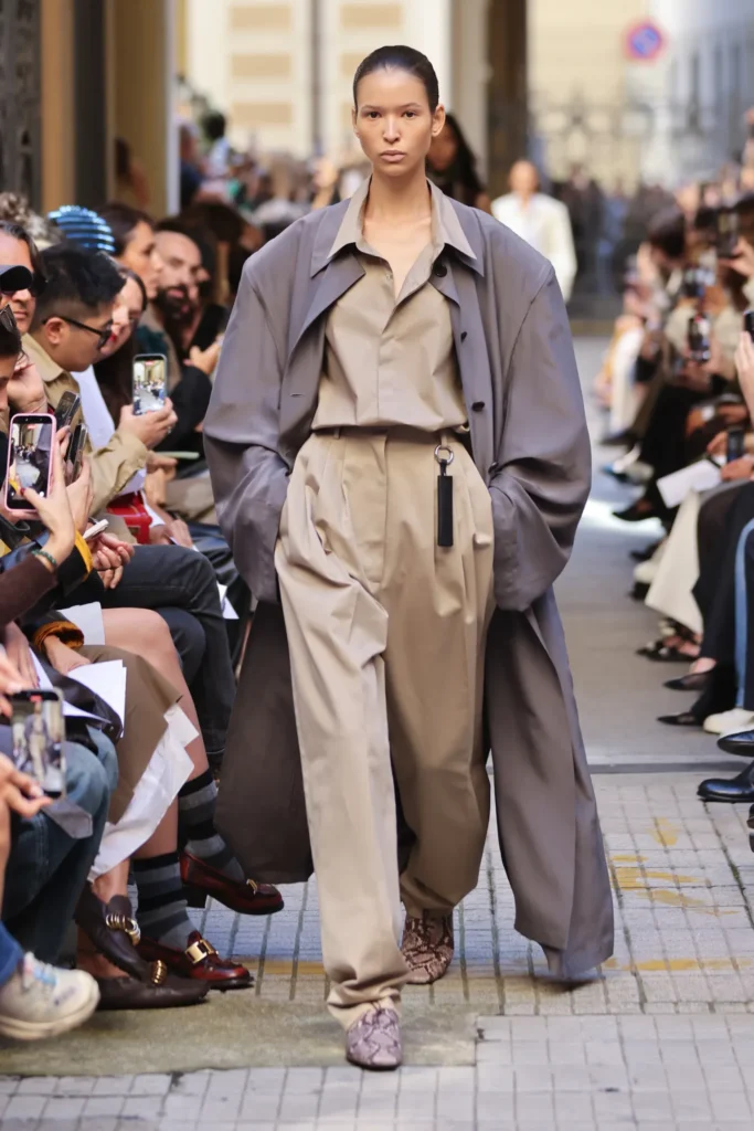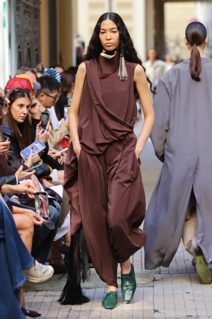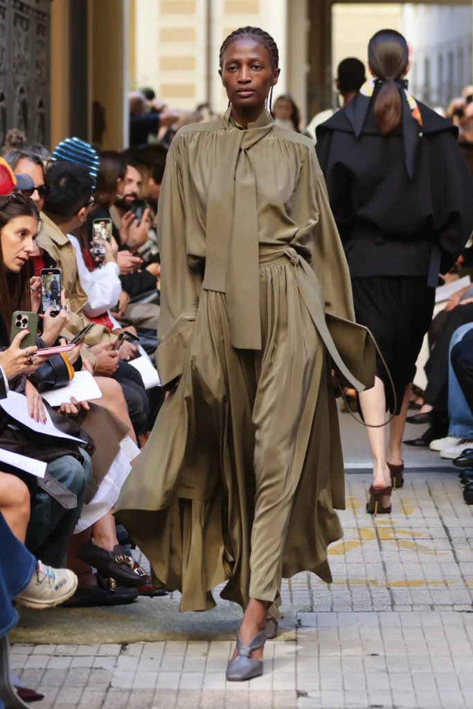 The earthy palette of chocolate, stone, and corn was punctuated by shimmering silks inspired by Berber textiles. Highlights included a dramatic taupe coat layered over a khaki military-inflected look, and a monochromatic olive green ensemble pairing a bow-tied blouse with wide-leg trousers. Jackets came with exaggerated shawl collars or strong shoulders, often styled with patterned silk scarves knotted at the neck, suggesting both desert practicality and poetic flair.