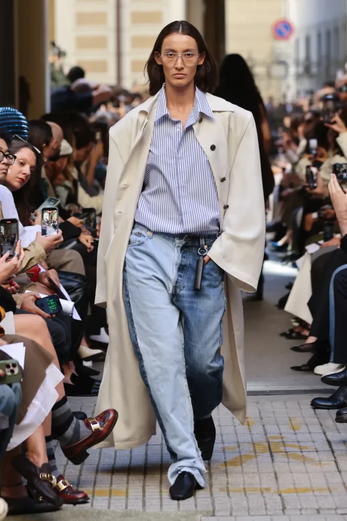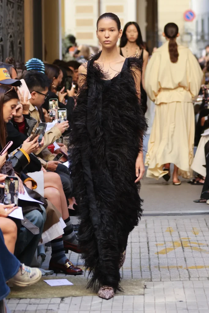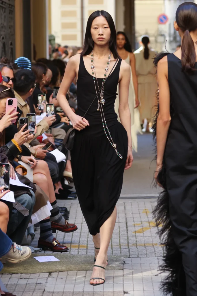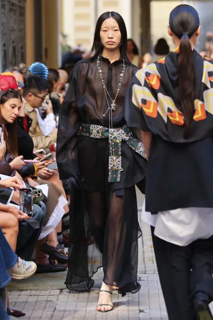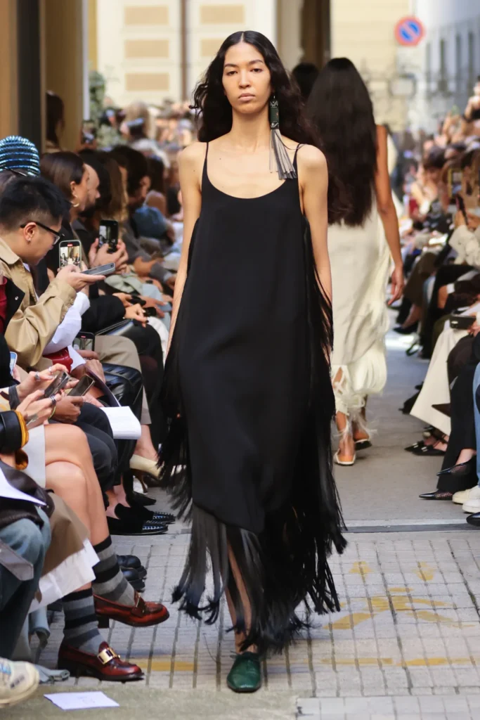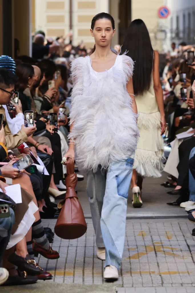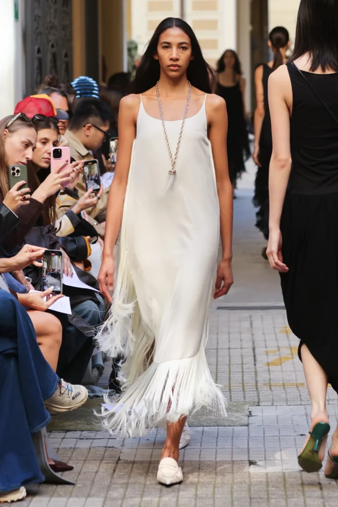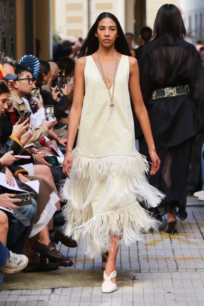 Amazigh embroidered panels appeared on sculptural white tops and trousers, as well as on an oversized fringed clutch, modeled after traditional camel water carriers. For evening, Calcaterra injected sensuality with feathers and fringe on fitted dresses, tiered skirts, and a playful white tunic styled with faded patchwork jeans, creating a relaxed, youthful counterpoint.
