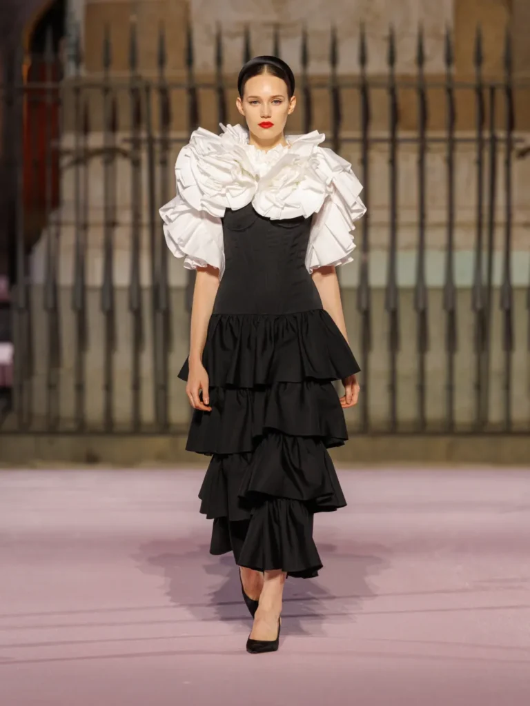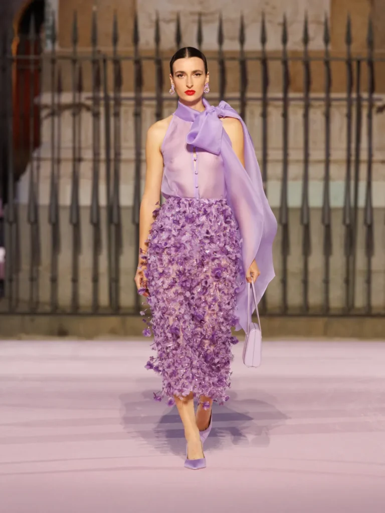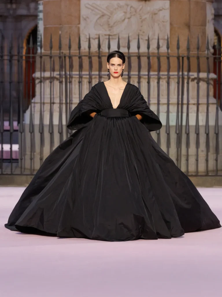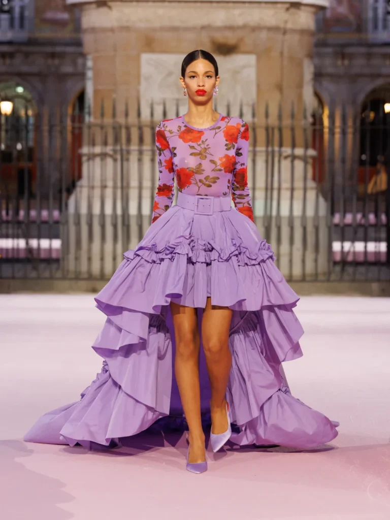 The show opened with a striking black gown with a sweeping train, setting a tone of grandeur before models paraded in infanta-inspired dresses recalling Velázquez and El Greco. Gordon balanced this historic influence with modern innovations, such as crystal-outlined cage bustiers mimicking the cobblestones of the square and bubble lilac gowns adorned with layered violet appliqués.