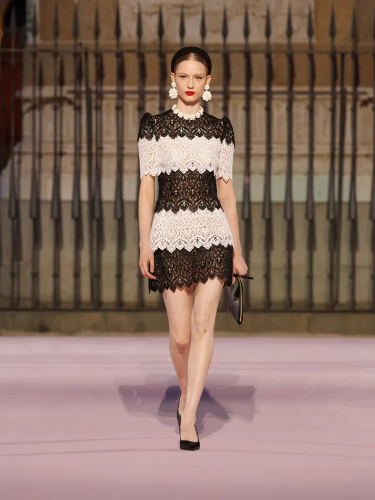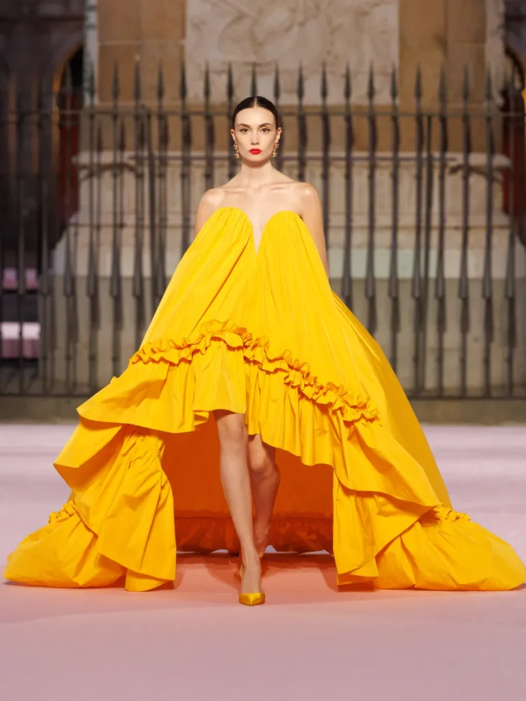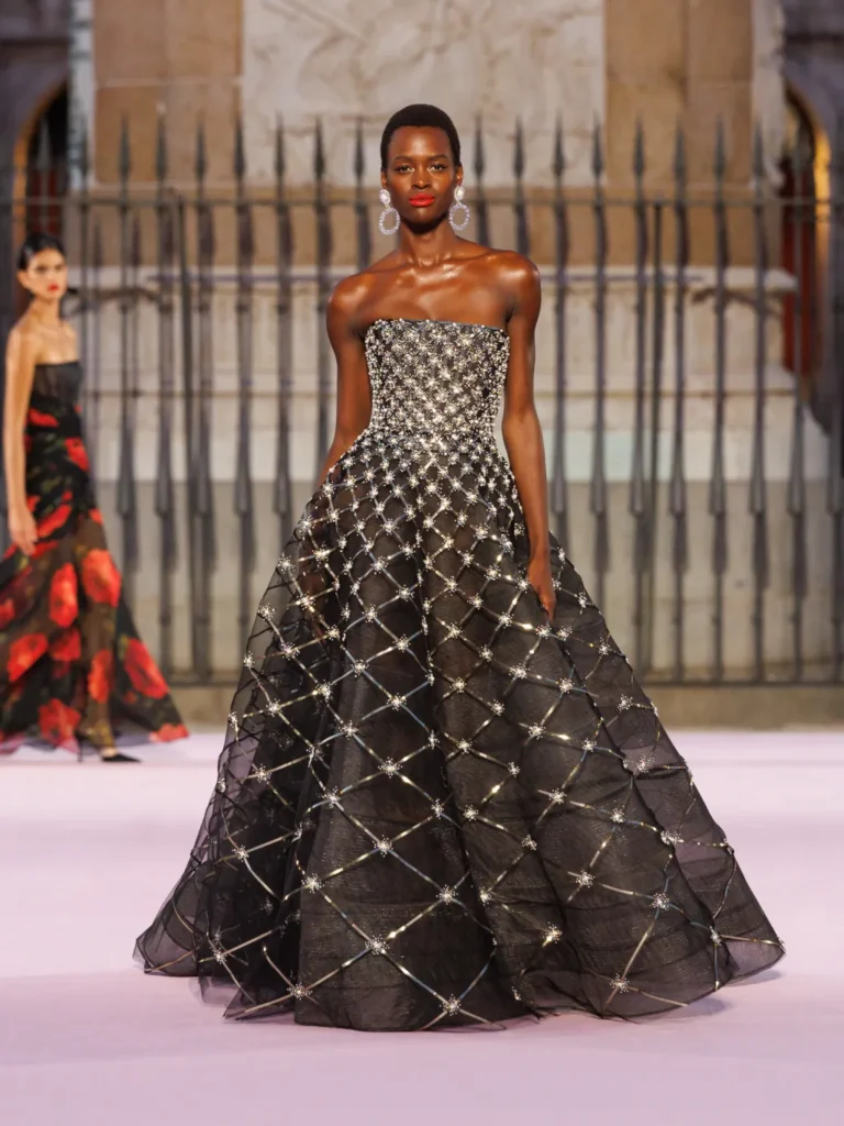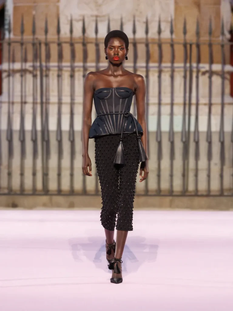 The show opened with a striking black gown with a sweeping train, setting a tone of grandeur before models paraded in infanta-inspired dresses recalling Velázquez and El Greco. Gordon balanced this historic influence with modern innovations, such as crystal-outlined cage bustiers mimicking the cobblestones of the square and bubble lilac gowns adorned with layered violet appliqués.