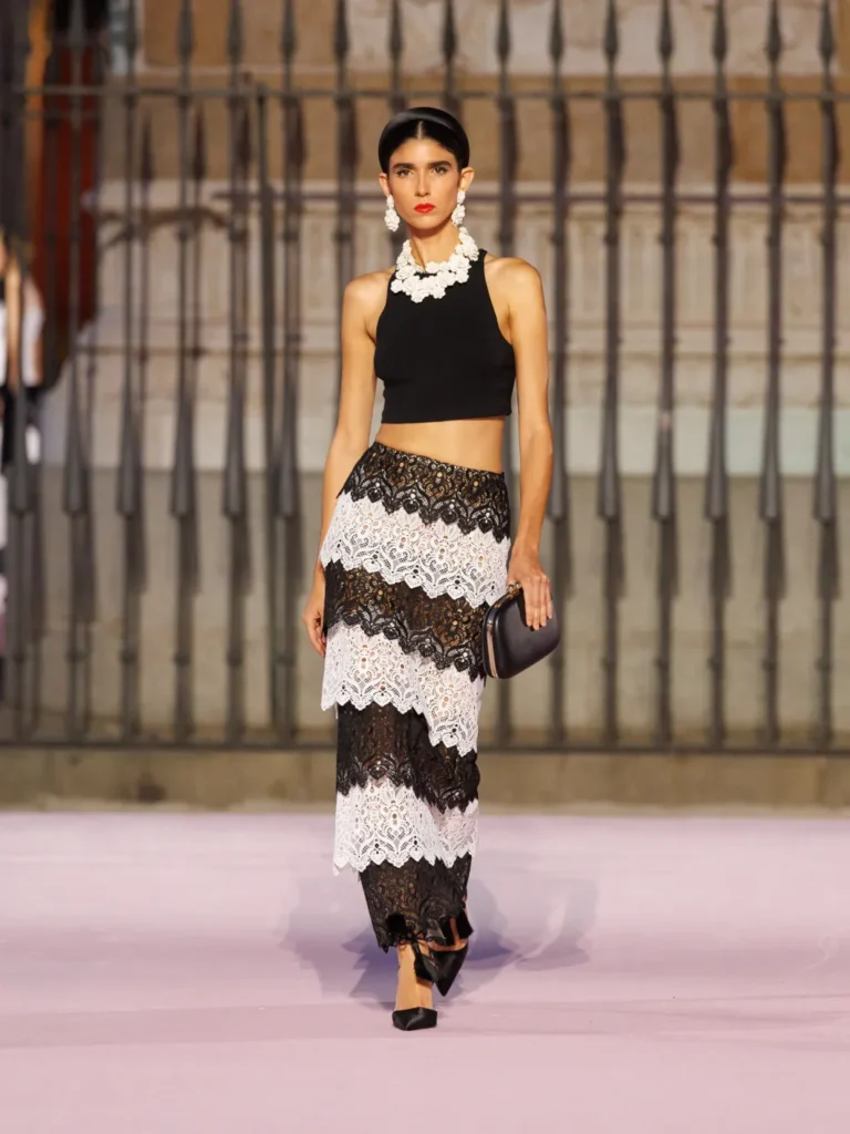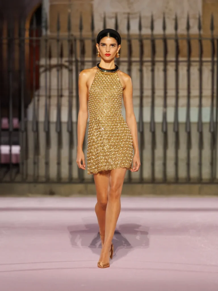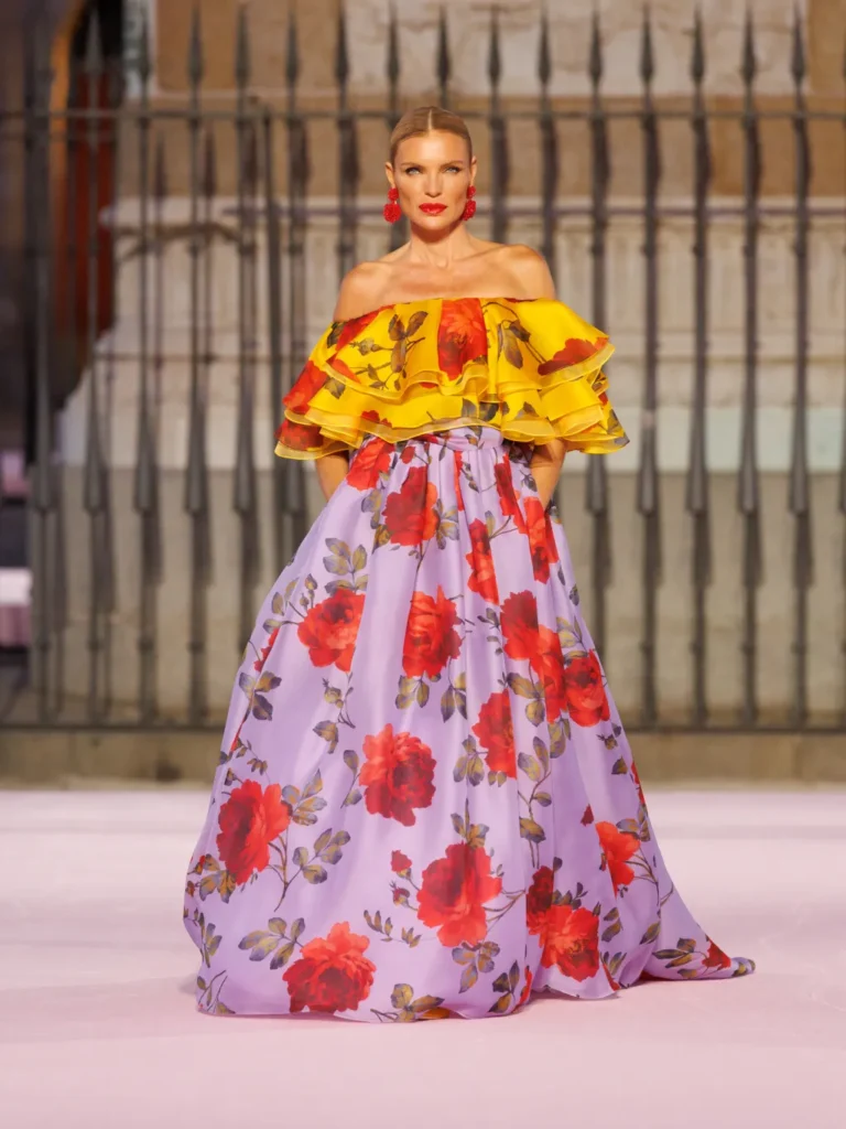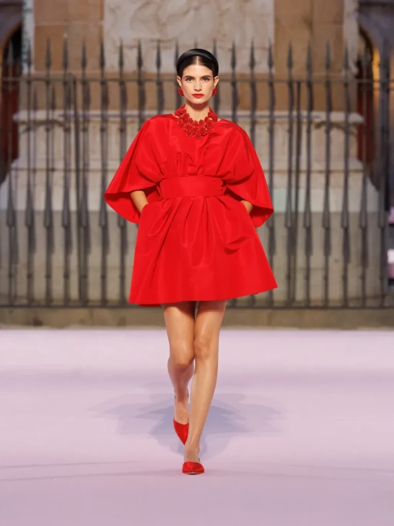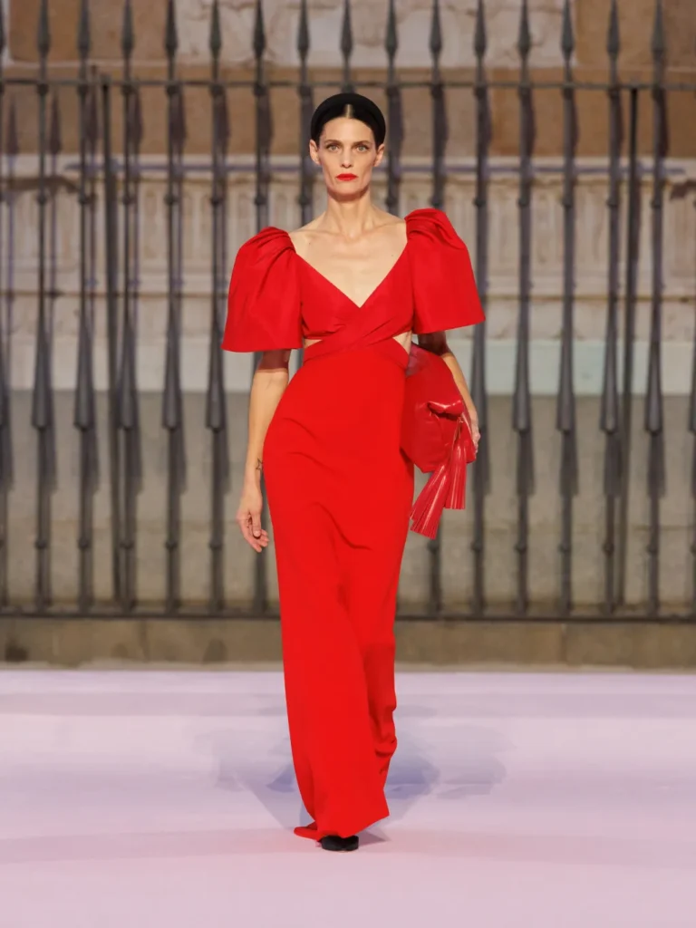 Local cultural references were seamlessly woven throughout: matador jackets shimmering with jet beads, fan-shaped handbags, and handmade black capes by Casa Seseña. The cinematic flair echoed Spanish film heroines, with playful checks and halter-neck dresses that seemed to step out of an Almodóvar movie. Supermodel Esther Cañadas delivered one of the most memorable moments, gliding down the runway in a bright red off-the-shoulder gown that embodied strength and sensuality.