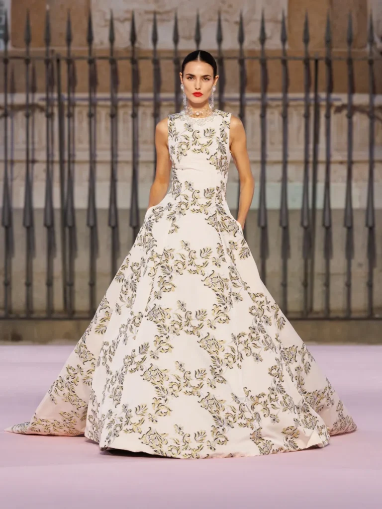 For its first-ever European runway show, Carolina Herrera transformed Madrid’s historic Plaza Mayor into a blush-pink catwalk that radiated drama, color, and cultural pride. The star-studded front row—including Becky G, Lucy Hale, Sofia Carson, and Alisha Boe—watched as creative director Wes Gordon unveiled 77 looks that celebrated femininity through bold silhouettes, floral extravagance, and nods to Spanish tradition.