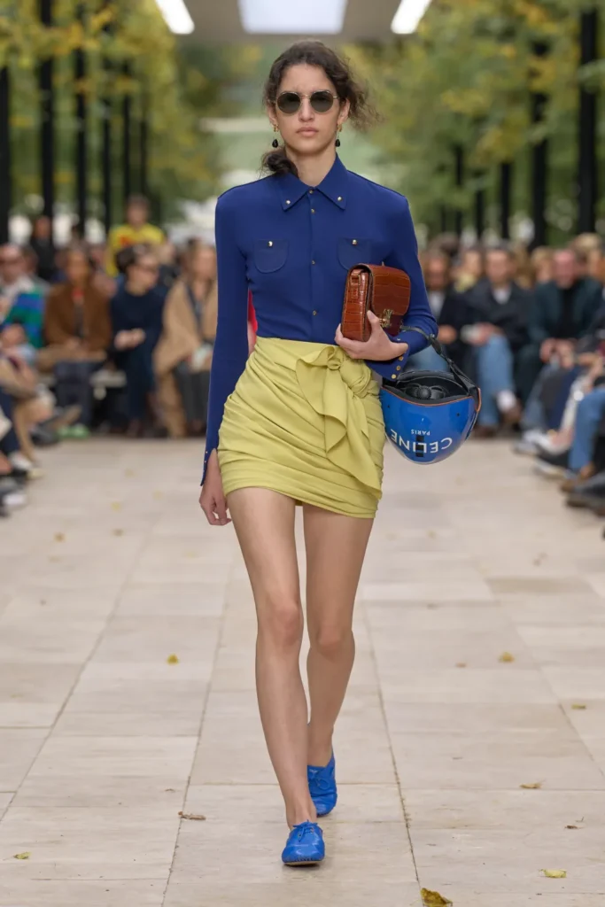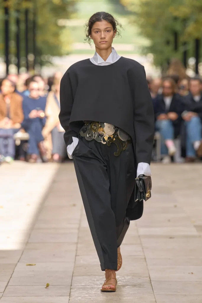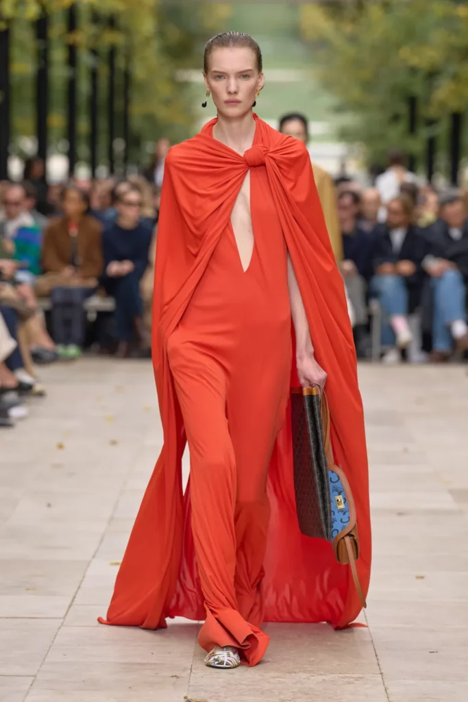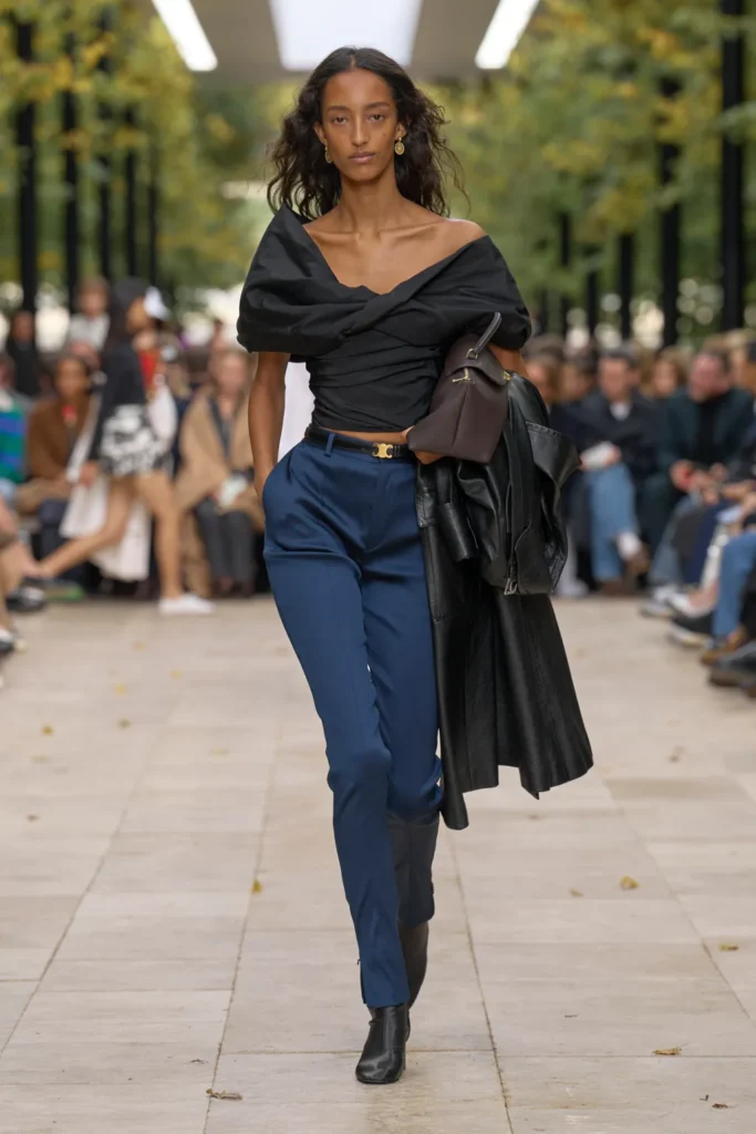 This new Celine defies the myth of Parisian restraint. Scarflike collars spilled generously over coats and blazers; bohemian jewelry caught the light; practical shoes replaced stilettos; and handbags were slung across shoulders or tucked casually under arms — an attitude, not a statement.
