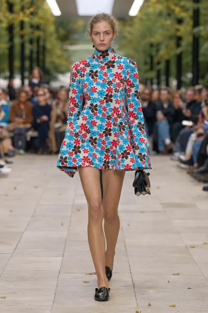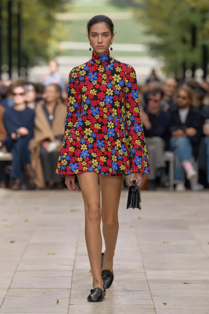 There were new pleasures too — easy baby-doll dresses in bouclé soigné and trippy floral prints, a whimsical nod to the 1960s spirit that ran quietly through the collection. Scattered among them were bicycle helmets emblazoned with the Celine logo, a playful reminder that in Rider’s world, luxury doesn’t mean standing still.