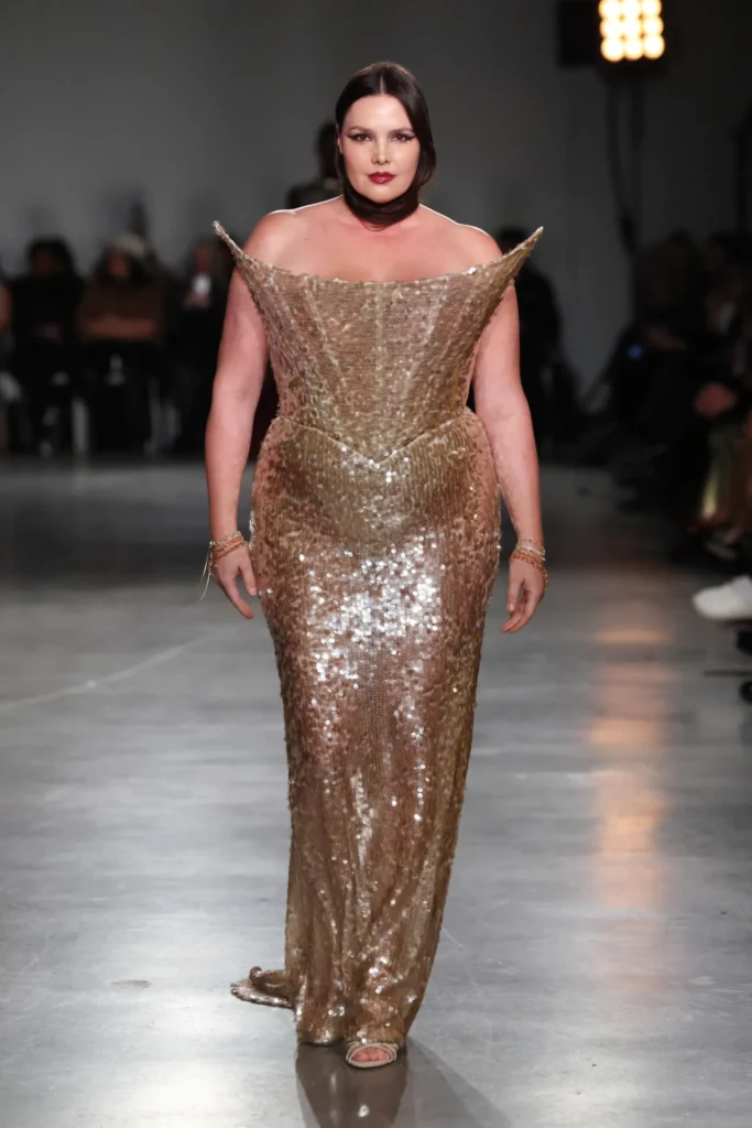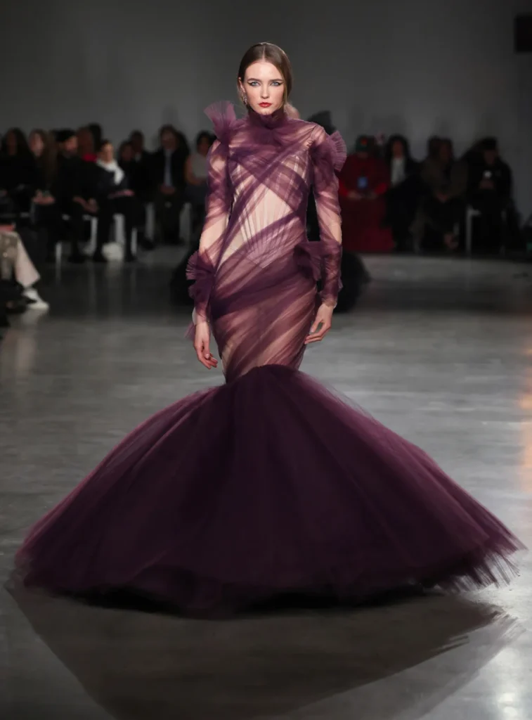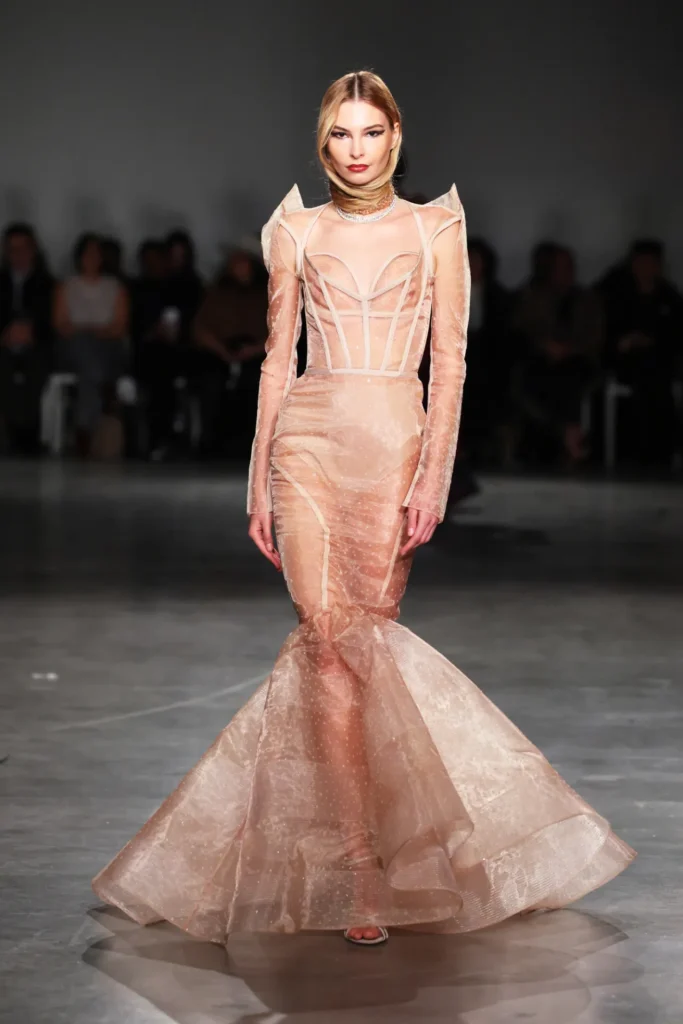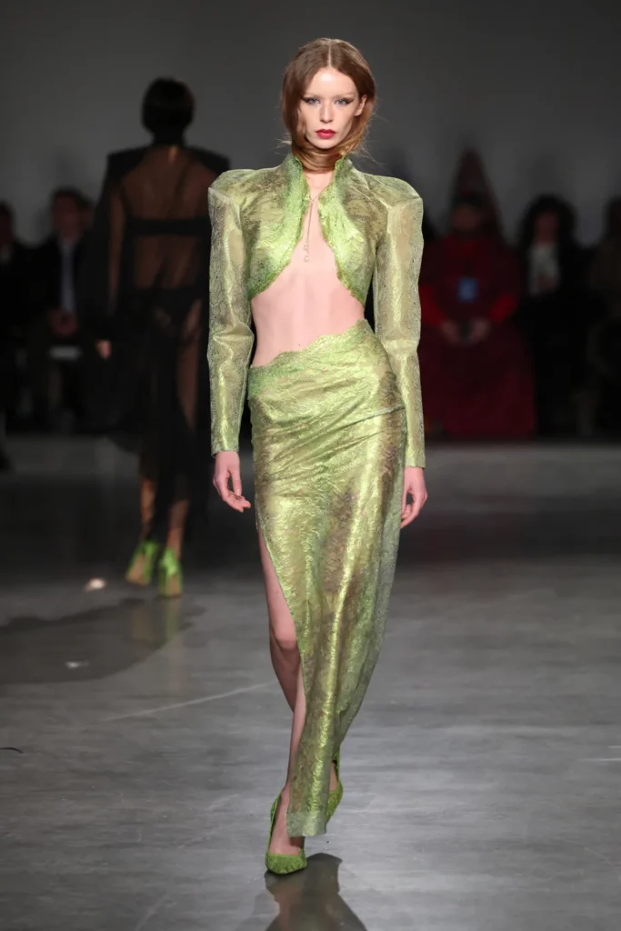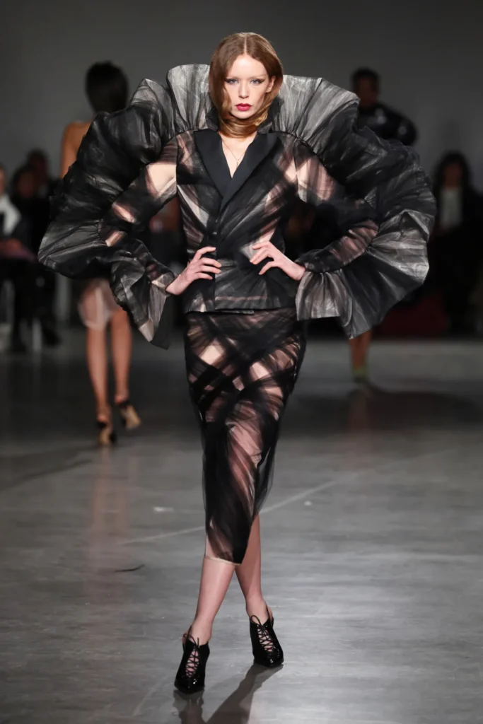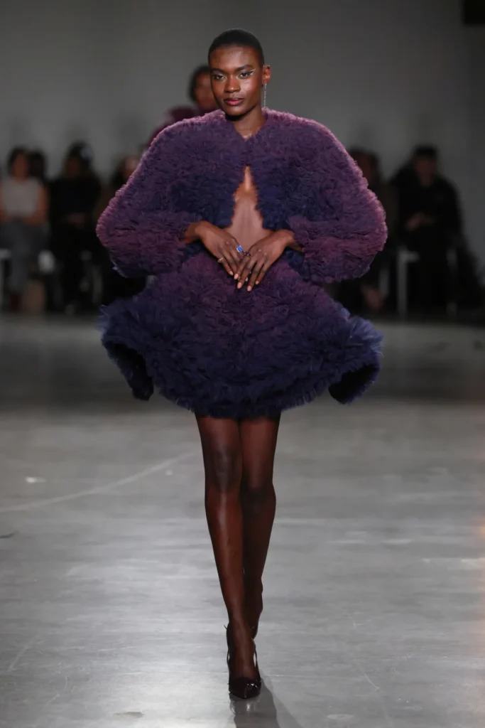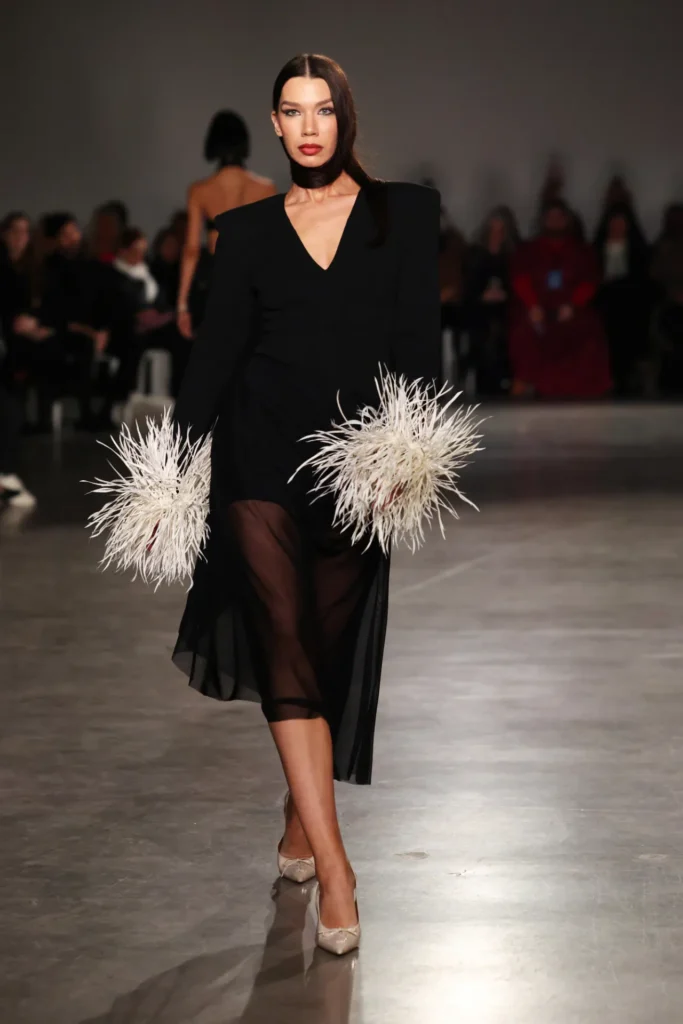 Outerwear set the tone. A sweeping coat and cropped peplum jacket appeared to be crafted from feathers, yet revealed themselves as meticulously trimmed faux fur. Elsewhere, organza boning wrapped in tulle sculpted tuxedo jackets into wing-like forms, giving architectural rigidity to fabrics typically prized for fluidity. In contrast, a severe column gown rippled with black and silver sequins, its surface engineered to move like liquid metal. A mesh bodysuit spliced at the hip created the illusion of separation, allowing the silhouette to shift with every step.