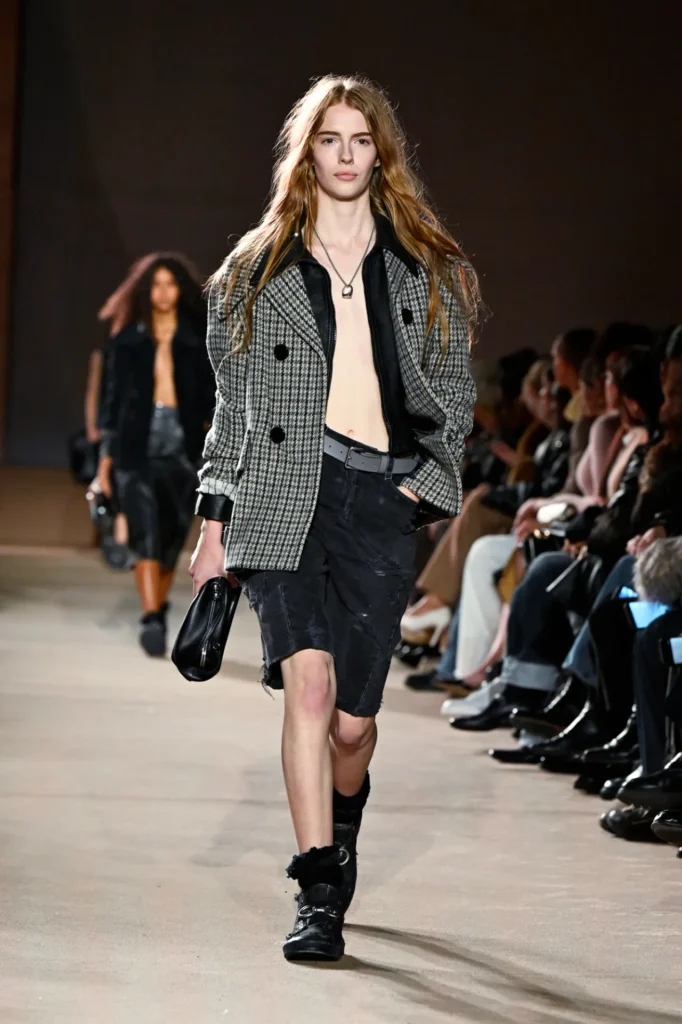 Nearly every look carried the patina of something thrifted and treasured. Denim shorts were patched with repurposed scraps; slim tailoring was pieced together from mismatched plaids, edged with flashes of leather at collars and cuffs. Jersey number tees, gray-washed denim, varsity knits with invented mascots, and plaid slip dresses collided across eras. The effect was nostalgic but not sentimental—sepia tones met jolts of saturated color, echoing the shift from black-and-white Kansas to Oz.