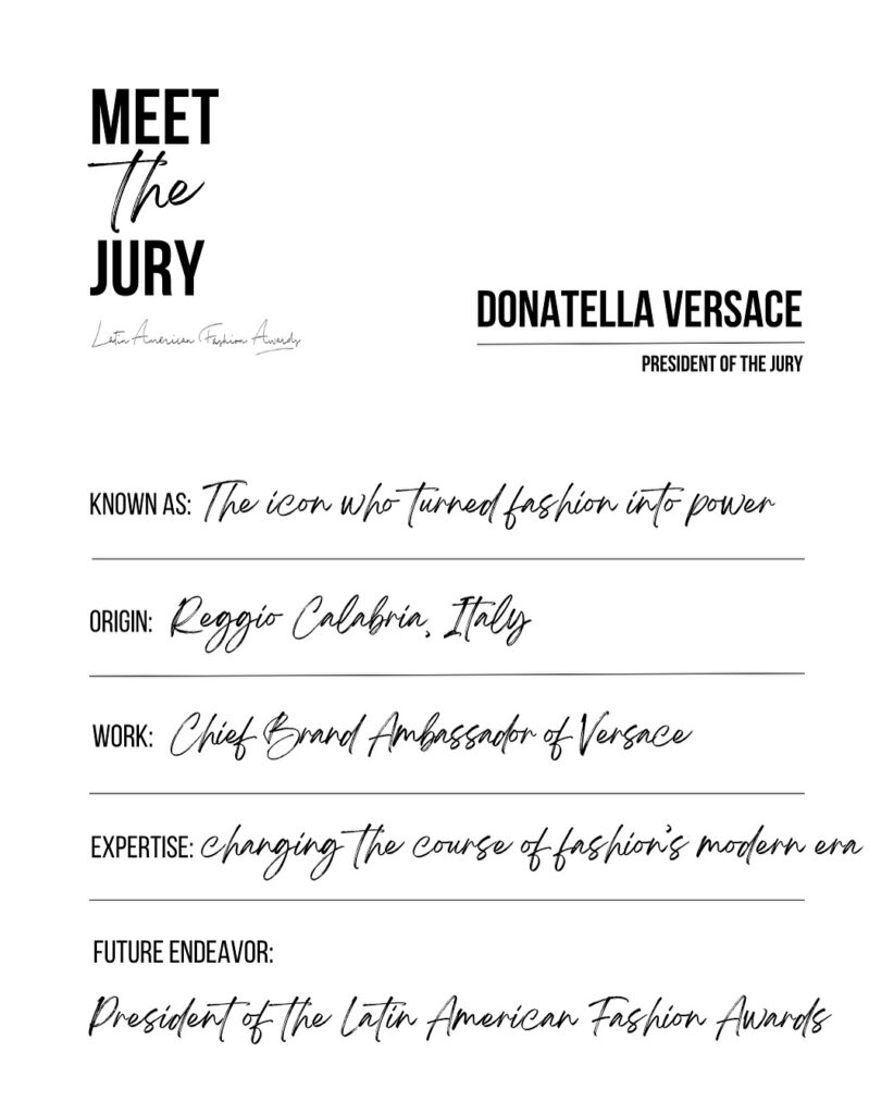 “I have always championed the next generation of design talent,” said Versace. “It has never been more important to support and encourage our global creative community, and I am truly honored to preside over the Latin American Fashion Awards.”