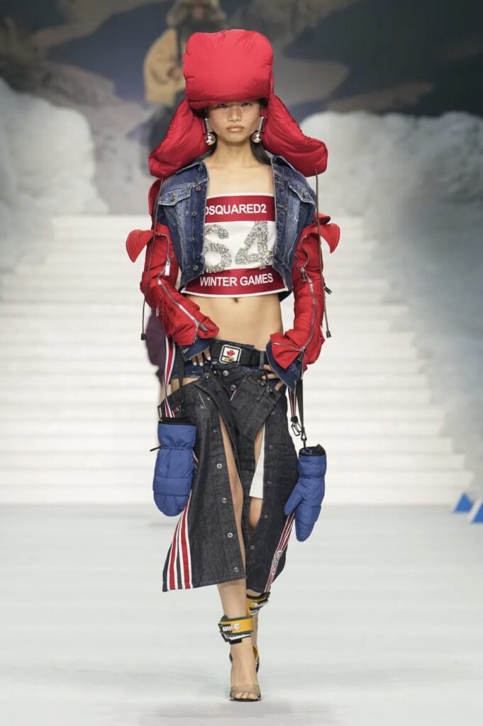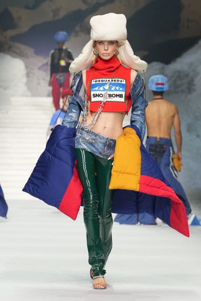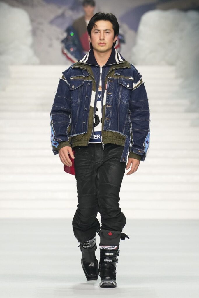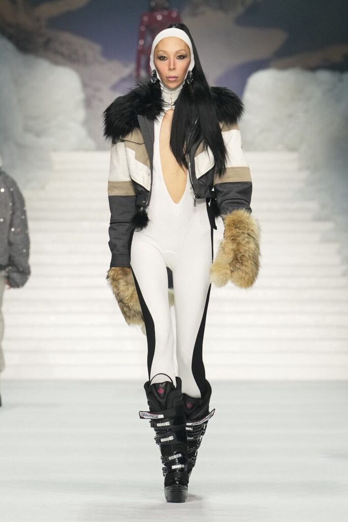 Dean and Dan Caten leaned fully into the alpine theme, reframing their established codes—hybrid dressing, high-octane sensuality, and sporty bravado—through the lens of winter performance. The timing was precise: a Canadian actor known for playing a hockey star opening a winter-sport–inspired show, just ahead of the Milano Cortina 2026 Winter Olympics.