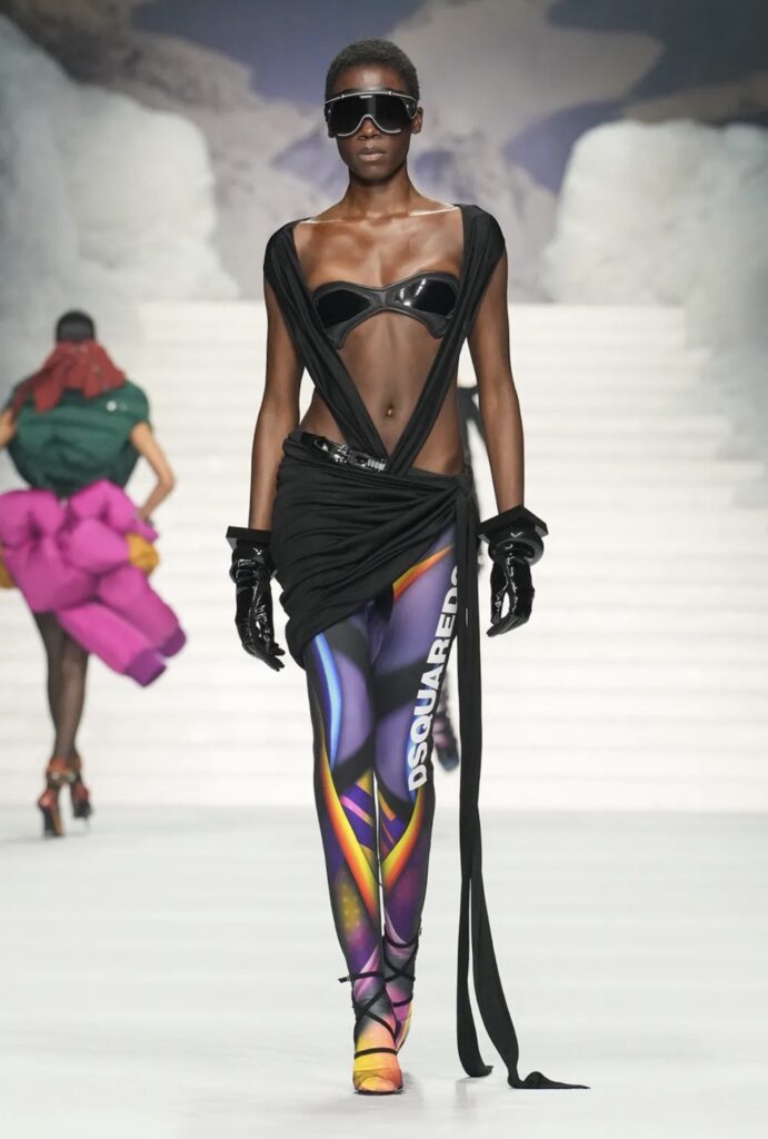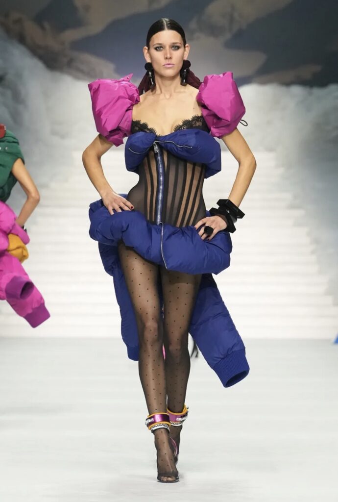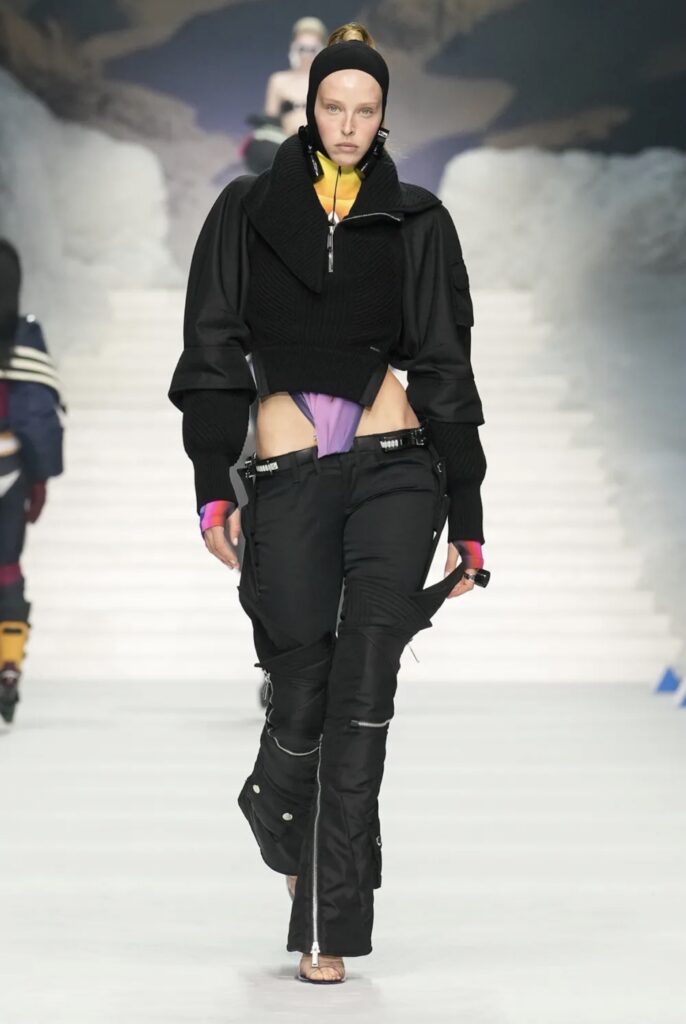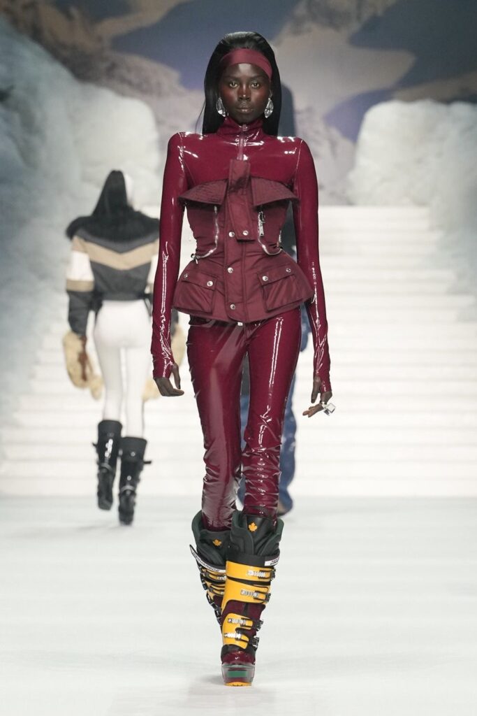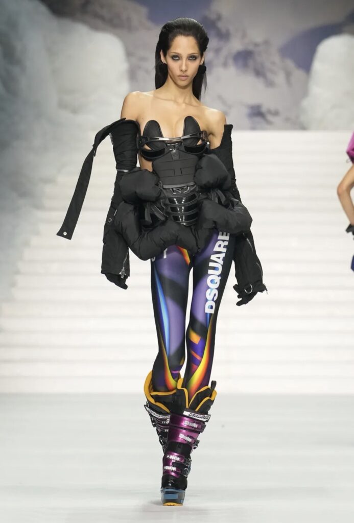 Après-ski dressing skewed unapologetically seductive. Glossy latex looks, cropped ski suits with plunging V-necks, and tops cut to expose the hips injected eroticism into performance wear. The effect intensified with exaggerated protective gear that echoed corsetry, feather-stacked mini dresses, and futuristic wedge ski boots that blurred the line between function and fantasy.