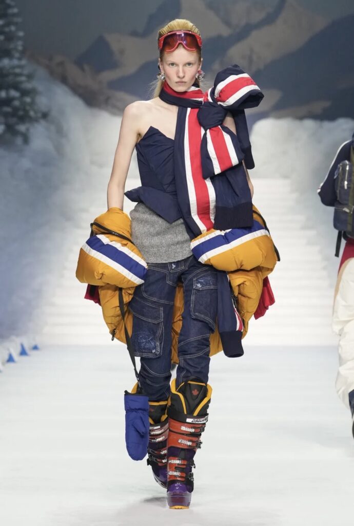 Accessories underscored the collection’s playful aggression, particularly in menswear. Square-toe cowboy boots with detachable gaiters nodded to ski footwear, while ski goggles engineered with Carrera converted seamlessly into everyday sunglasses.
