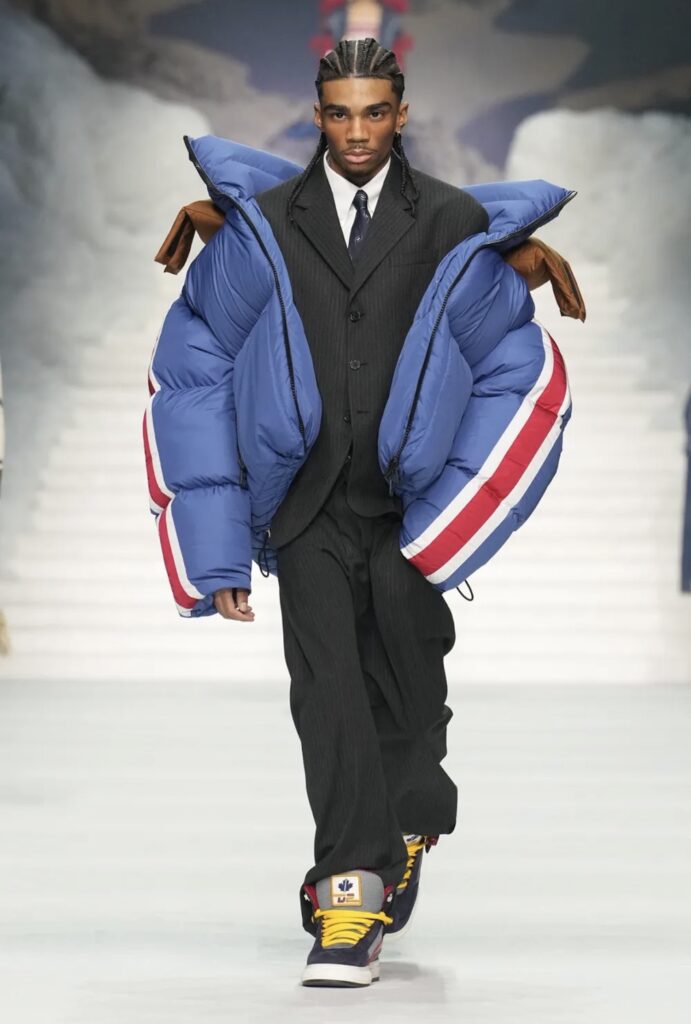 The collection revolved around modular layering and bold texture play. Puffer vests, parkas, and padded jackets in saturated hues anchored the lineup, styled with everything from ski base layers and long underwear to tailored suits. Chunky knits, oversized shearling coats, and plush faux-fur jackets added depth and visual weight, reinforcing the tactile richness of the offering.