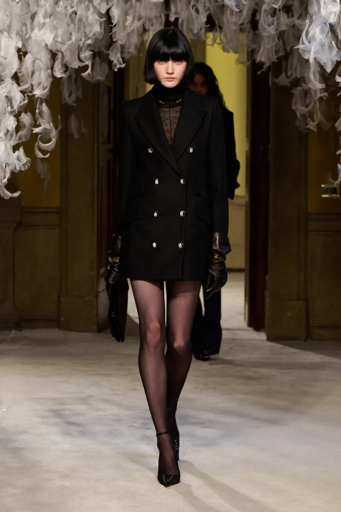Corsets and micro-hemlines coexisted with oversized, masculine trousers and sharp suiting, underscoring the designer’s thesis: power is plural. Whether gothic-leaning or strictly tailored, the Franchi woman leads. This season, she does so with a whisper of lace—and a roar beneath it.