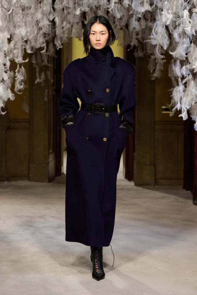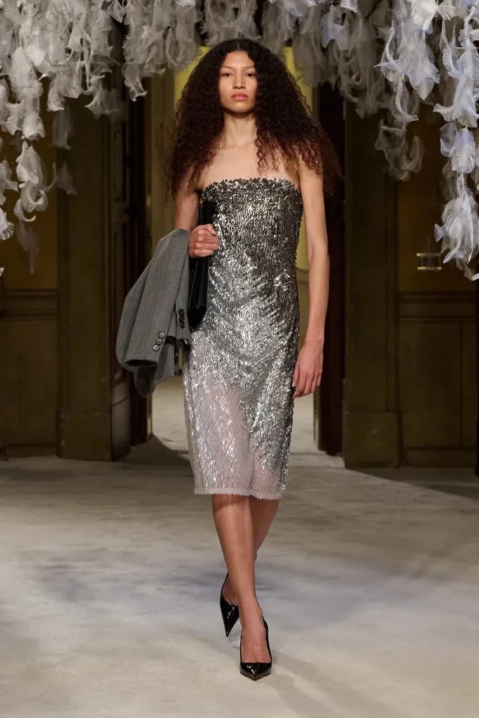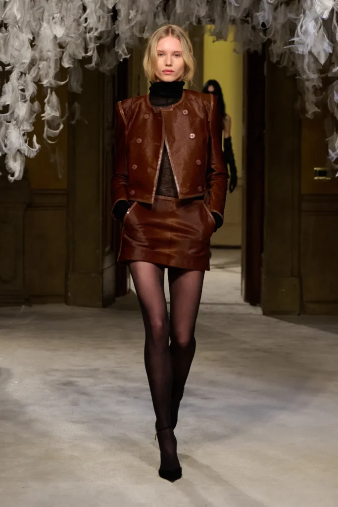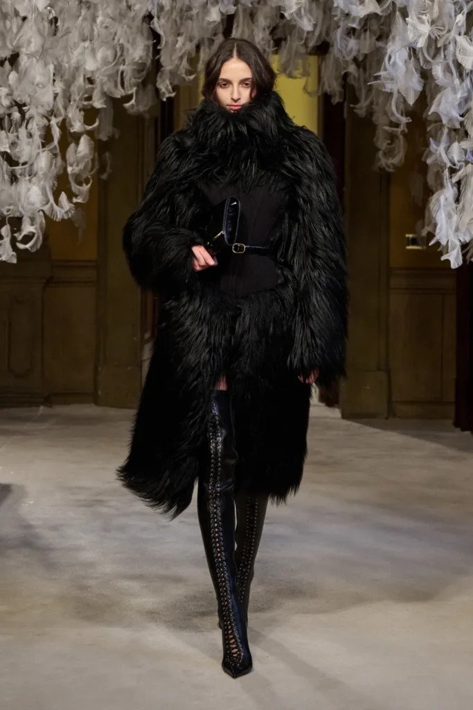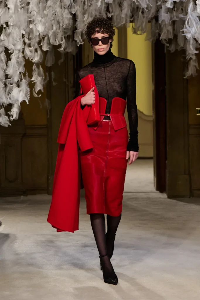 Tailoring formed the backbone. Blood-red, jet-black, and caramel pony-hair suits were cut close to the body, styled with corsets or whisper-thin knits that created a near-topless illusion. A navy coat with epaulets and a charcoal suit flecked with subtle sparkle reinforced the collection’s structured authority. Coat-dresses sculpted with padded hips and defined upper pockets emphasized curvature while maintaining control.