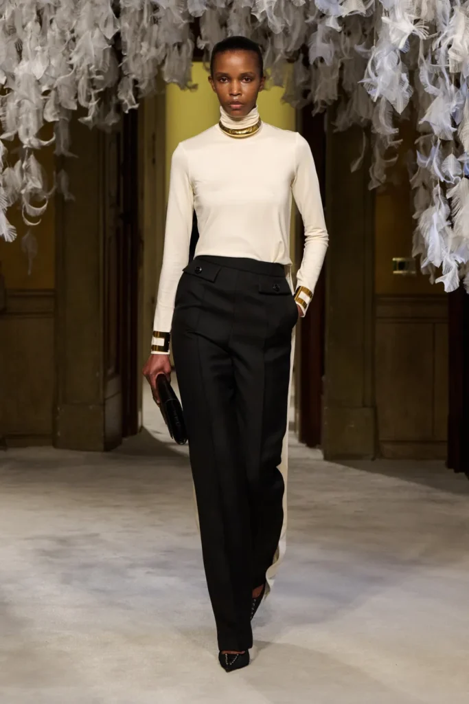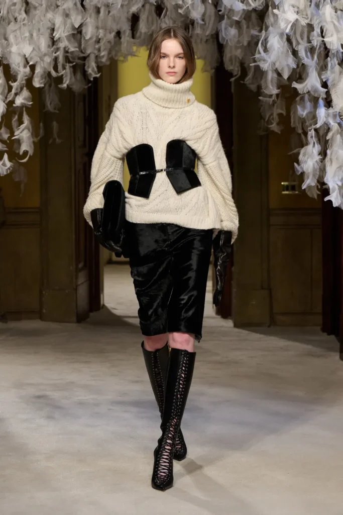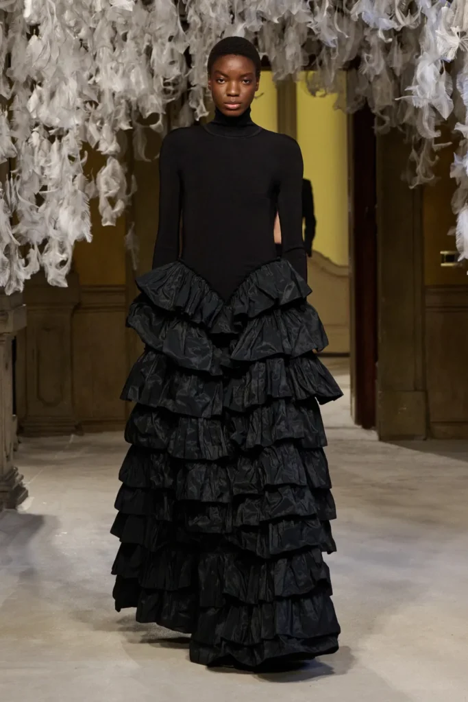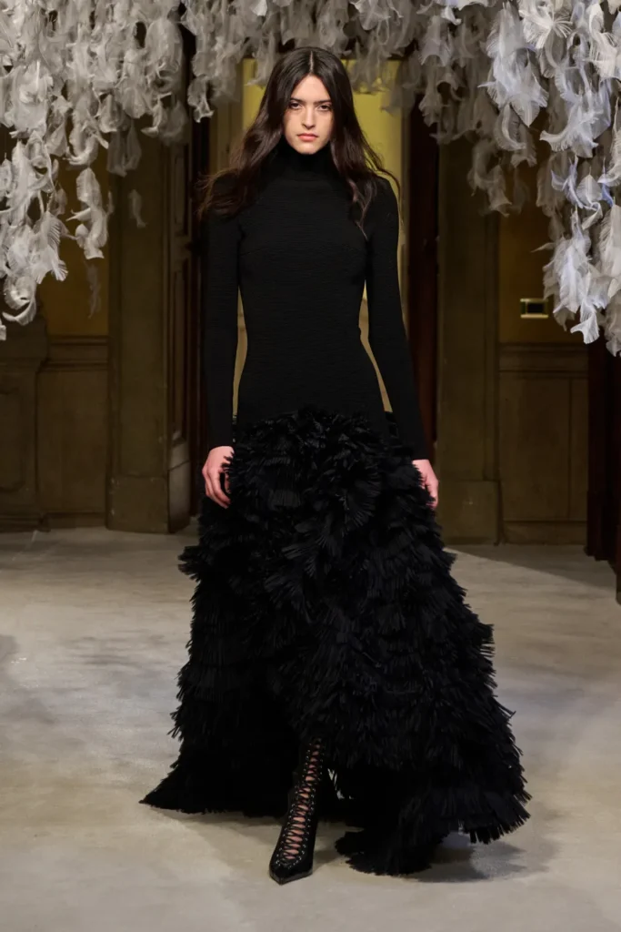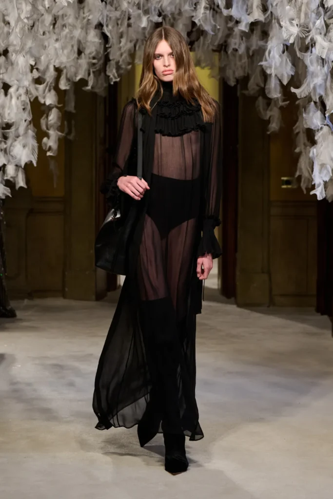 Franchi balanced that severity with transparency and softness. Sheer black cashmere, fluid dark gowns, and negligee dresses layered over lingerie introduced vulnerability without sacrificing command. High-neck evening tops extended into floor-length skirts with ruffled hems, evoking Victorian modesty reframed through a sensual lens.