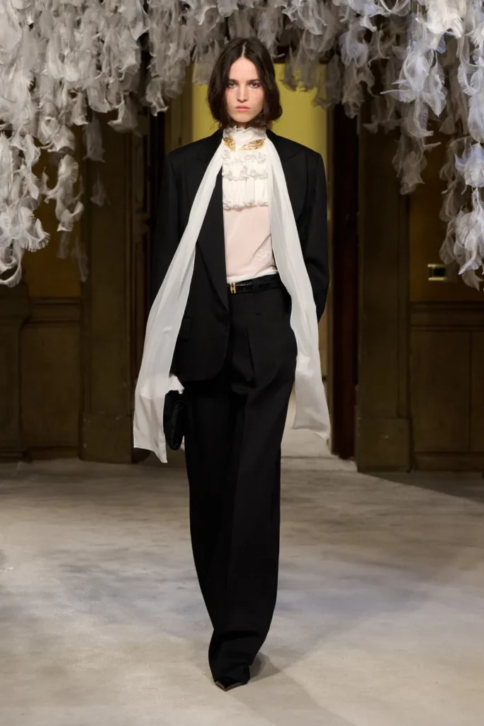 Presented at Milan’s Palazzo Acerbi, the 17th-century baroque residence Franchi acquired last year, the show embraced atmosphere without losing focus. The designer looked to the Victorian era—its rigor, mystique, and coded sensuality—as a framework for contemporary power dressing. The result was disciplined yet provocative.