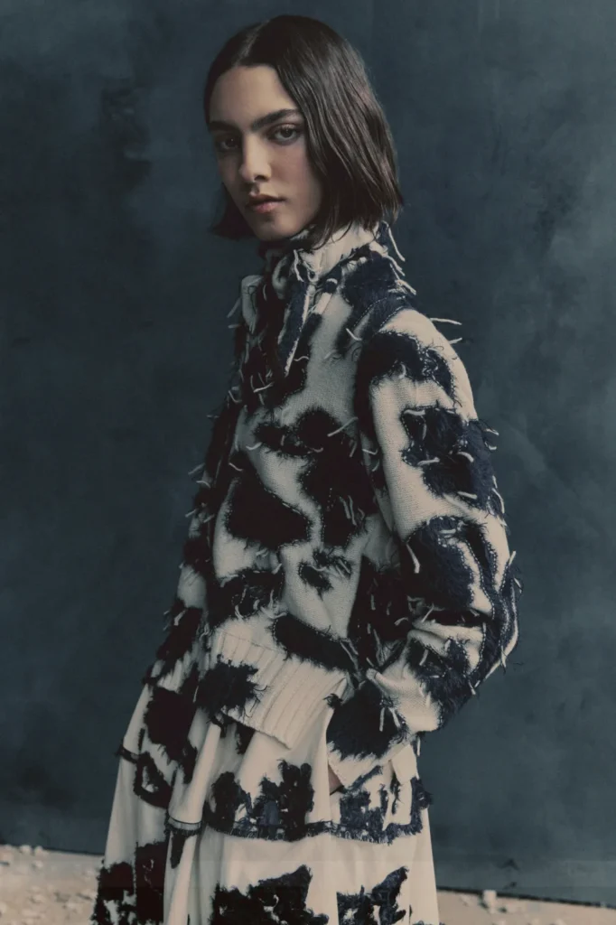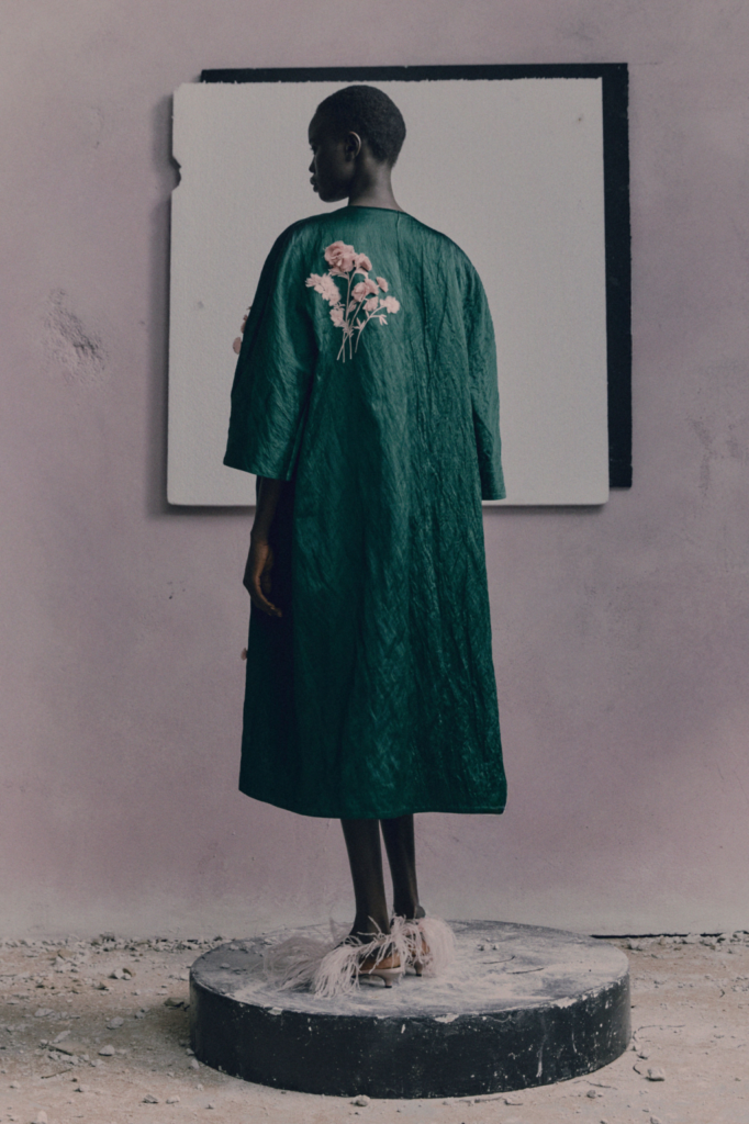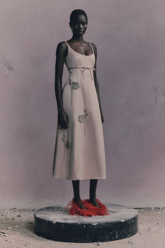 Moralioglu also mines his own archives, scattering familiar motifs across new silhouettes: blue swans gliding over a crinkled white high-neck gown; crystal carnations cascading down a teal evening coat; chalk-like white butterflies fluttering across a rounded-shoulder denim coat. These callbacks feel intentional, a quiet celebration of two decades of storytelling.