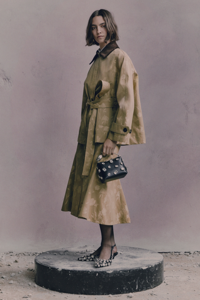 As expected from Moralioglu, the lineup is lavish. Evening coats glitter with hand-applied crystals; three-dimensional florals bloom across dresses, cardigans, and skirts. High-ruffled white blouses and gowns nod to the dandies and poets of the era, lending a sense of historical reverie without feeling costume-bound.