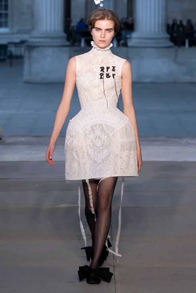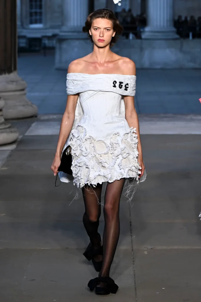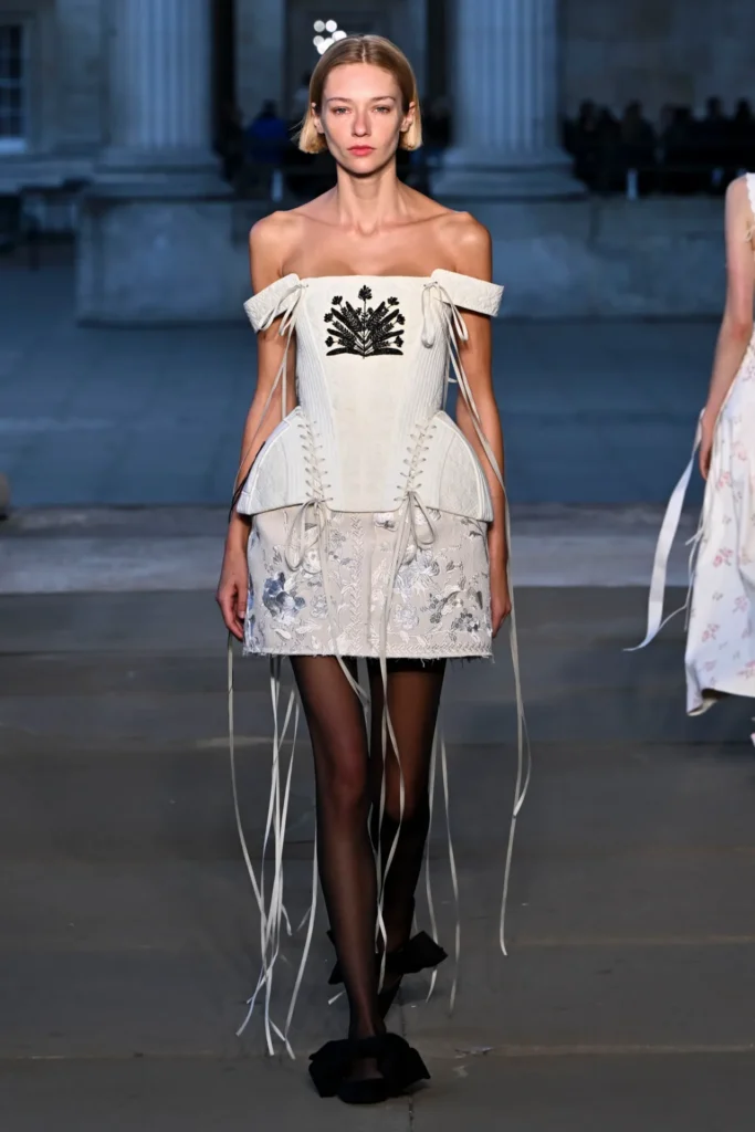 Over 40 looks graced the runway, each weaving together past lives and faraway landscapes with contemporary precision. There were corset-shaped minidresses crafted from antique lace and coarse burlap, adorned with shimmering crystals and intricate floral embroidery; structured coats and gowns with high lace collars, panniers, and corseted bodices, echoing the opulence of Versailles; and fluid silhouettes in vivid hues of hot pink and neon green, inspired by Indian textiles and sari-like draping.