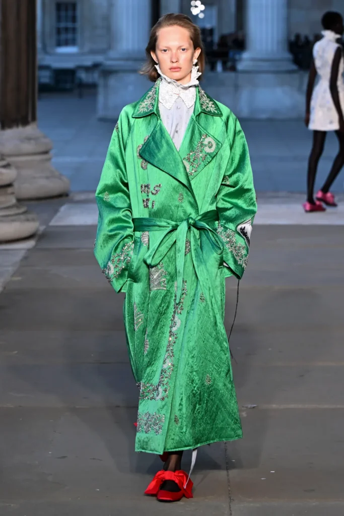 Luxurious satin trench coats, embellished with diamanté and floral appliqués, blurred the line between outerwear and eveningwear, while sensual sari-inspired gowns captured both intimacy and grandeur. Adding to the theatricality, flat shoes tied with fabric bows in shades of scarlet and rose grounded the looks, balancing drama with comfort.