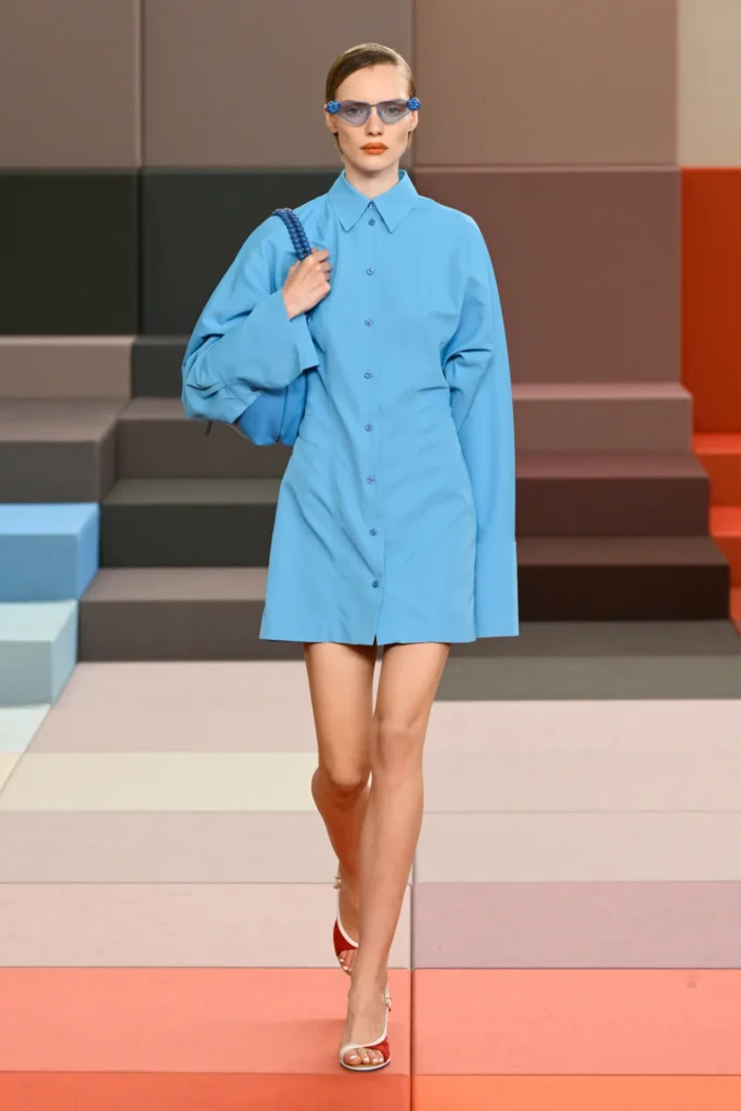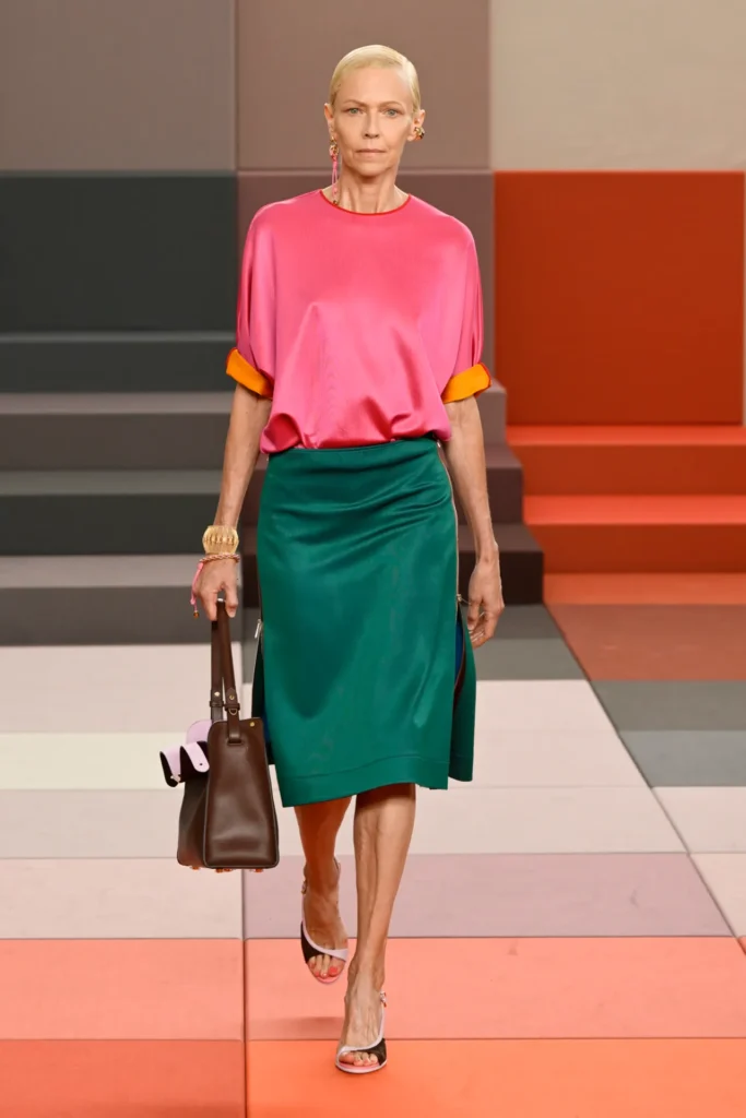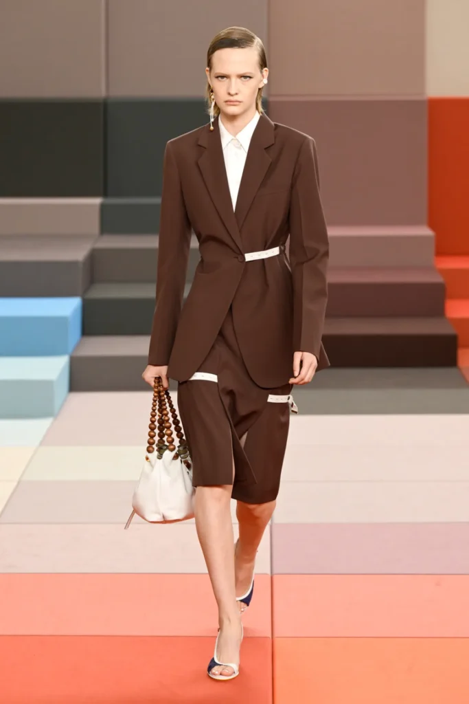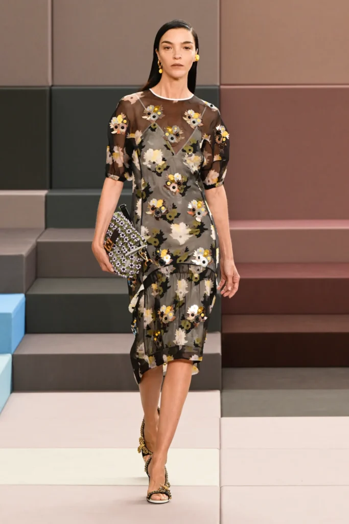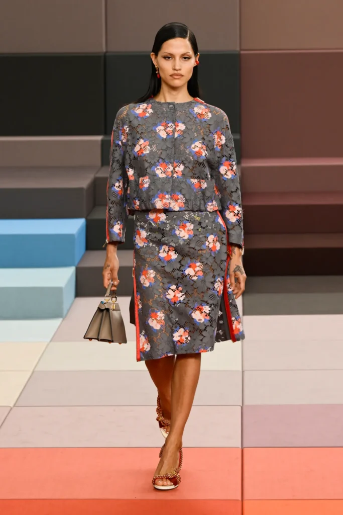 On a pixelated, wave-like stage designed by Marc Newson, Silvia Venturini Fendi unveiled a vision that redefined the very notion of “quiet luxury,” immersing it in a kaleidoscope of bold colors, psychedelic floral motifs, and theatrical accessories.