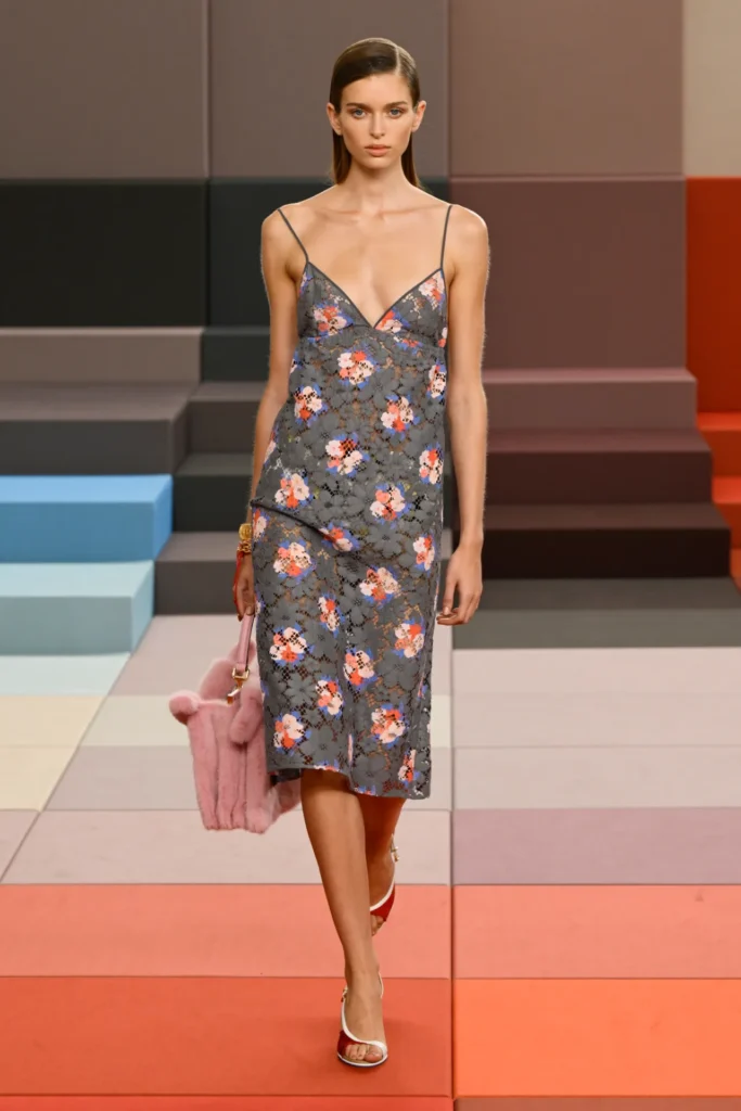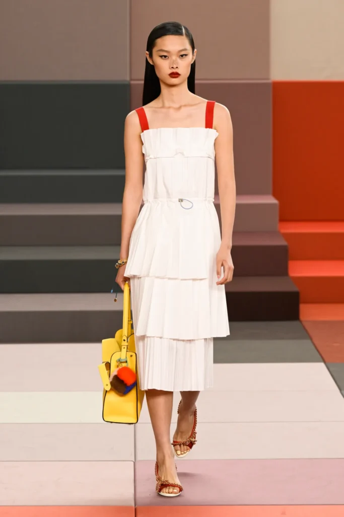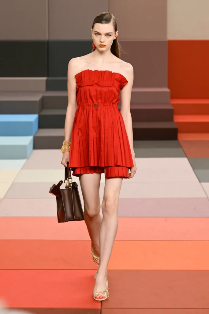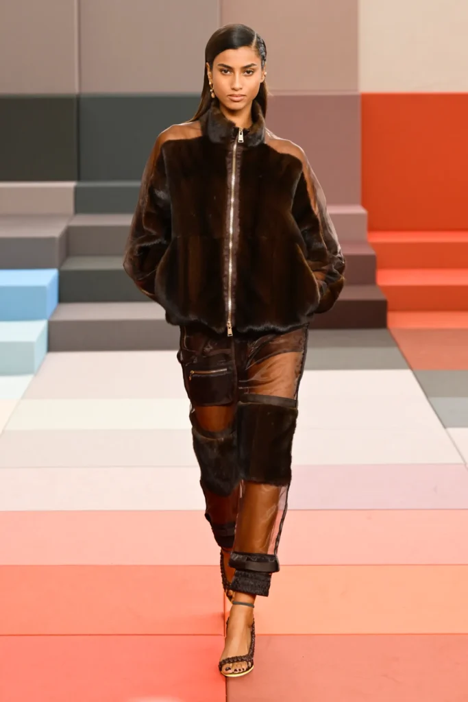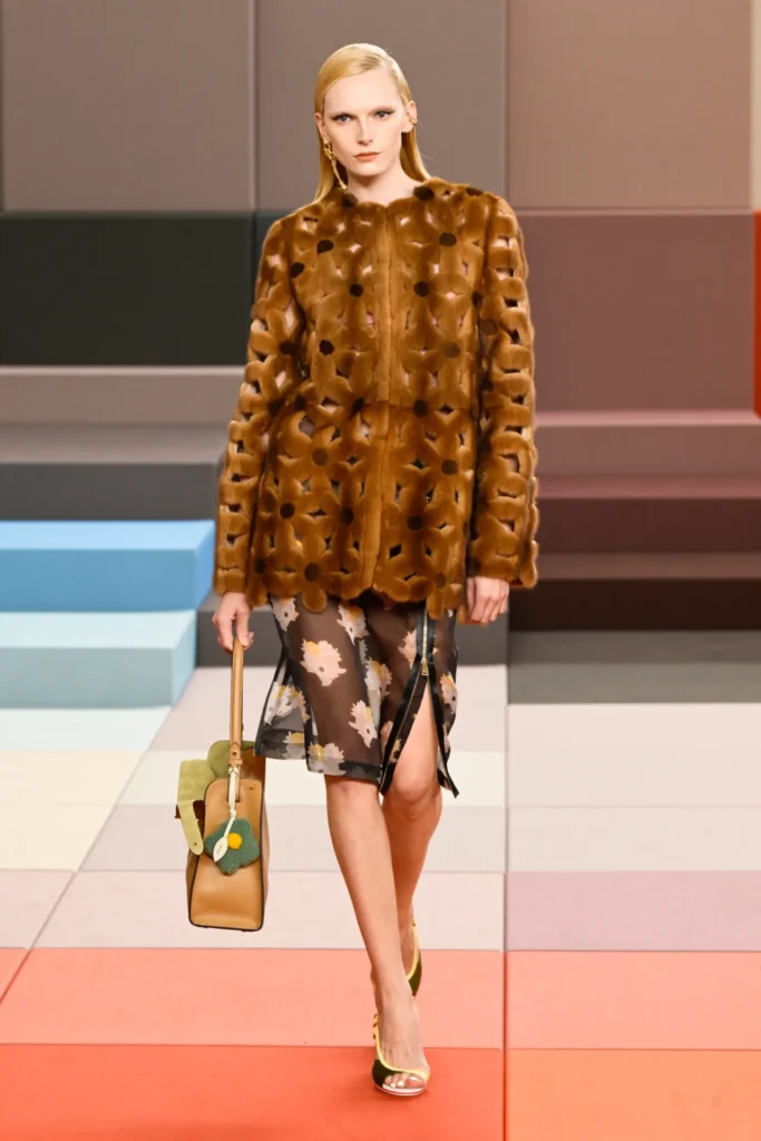 Accessories took center stage. The iconic Peekaboo bags revealed a sense of “private luxury” with hidden sequin embroideries inside, while the new Collier bag, featuring a sculptural built-in necklace, made its debut. Adding to the playful yet sophisticated spirit were hair-trimmed mesh loafers, whimsical charms, and jewel-like handbags, underscoring Fendi’s reputation for collectible, statement-making pieces.