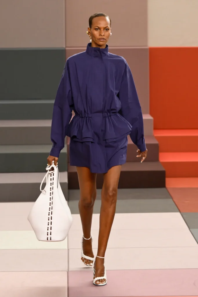 The collection highlighted the fusion of sportswear codes with couture craftsmanship: drawstrings, adjustable straps, elastic hems, and zippers appeared reinterpreted in luxurious versions, crafted in silk faille, laser-cut perforated leather, and glossy lightweight fabrics. A sporty jacket, paired with a sleek pencil skirt, evolved into the maison’s new idea of eveningwear.