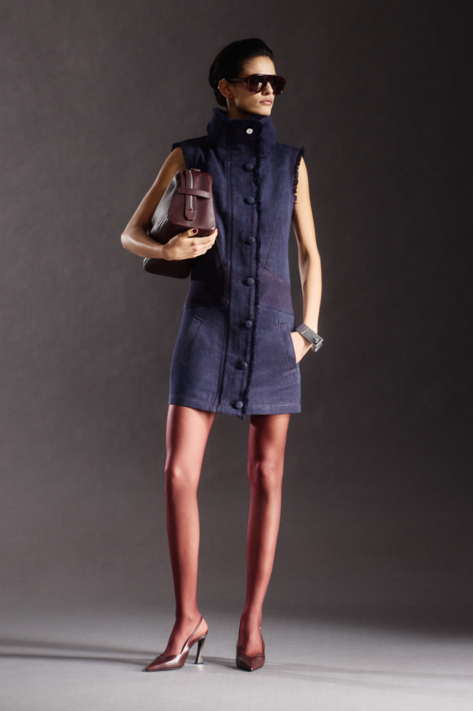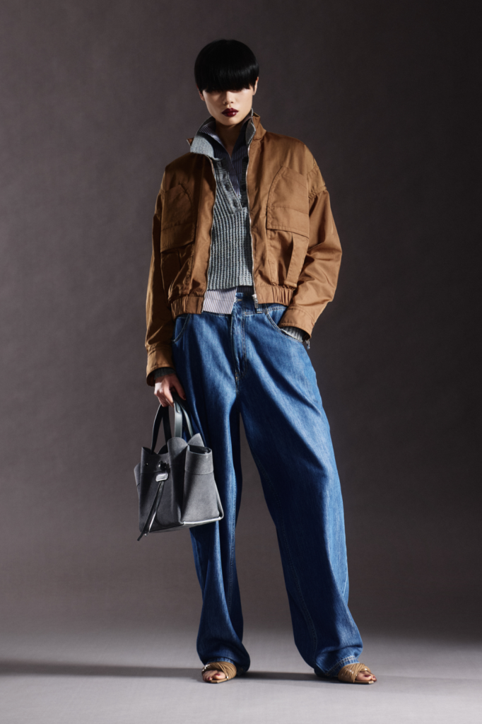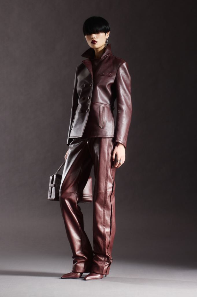 Fluidity and function defined the range. Silk handkerchief dresses in bluish purple gave way to technical cotton and denim jackets trimmed with leather, corduroy pantsuits, and shearling bombers, including a standout version treated with a crackled, glazed finish. Innovation surfaced in materials as well: wool was blended into Ferrari’s proprietary Q-cycle fabric—derived from recycled tires—softening its feel while elevating its refinement.