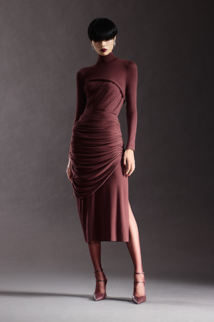 The collection unfolded in three seasonal drops, moving from light fabrics and brighter hues to richer textures in wool, flannel, and shearling. Throughout, Iannone’s focus on garment architecture remained sharp. A body-skimming cashmere jersey dress with precise pleating exemplified this approach, engineered with discreet side zips to ensure ease without sacrificing sensuality.