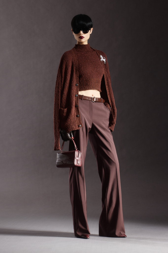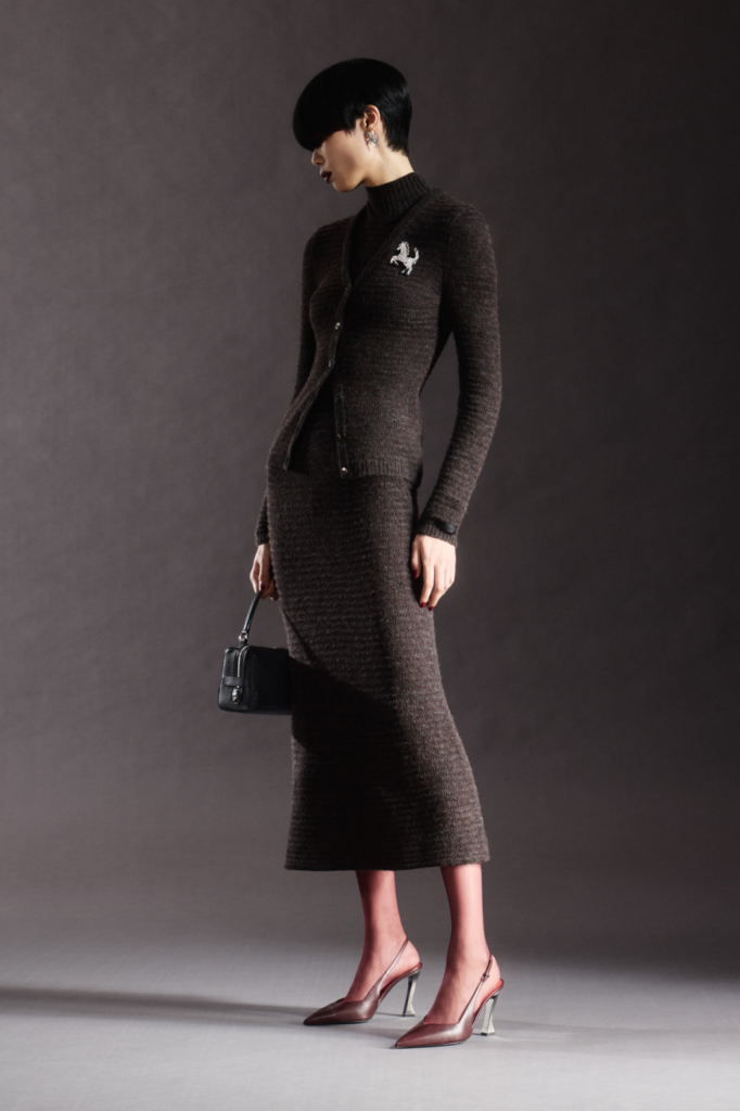 Accessories reinforced the collection’s momentum. Bags continued as bestsellers, led by the La Ferrari Dino and Ferrari GT soft bags. Sequined brooches shaped like the Prancing Horse added a restrained flash of whimsy. A palette of neutrals, rust, burgundy, and petrol grounded the looks, balancing heritage references with Ferrari’s modern, performance-led elegance.