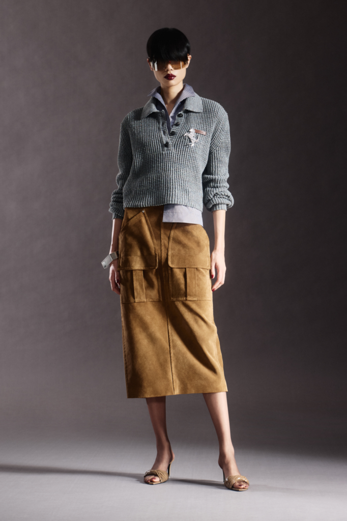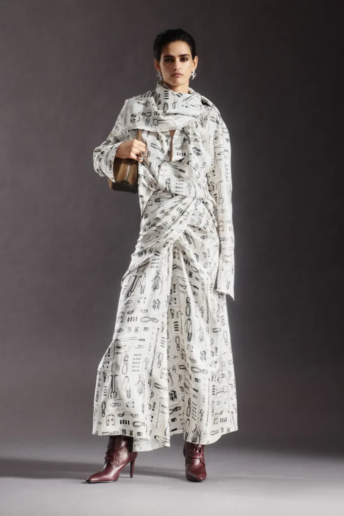 Classic British codes were subtly reworked. Prince of Wales checks appeared blurred across tailored pantsuits and pencil skirts, while shirtdresses and blouses featured prints inspired by Officina Ferrari tools. The workshop motif extended to boiler suits and blousons, detailed with tiny bolt rivets on denim shirts.