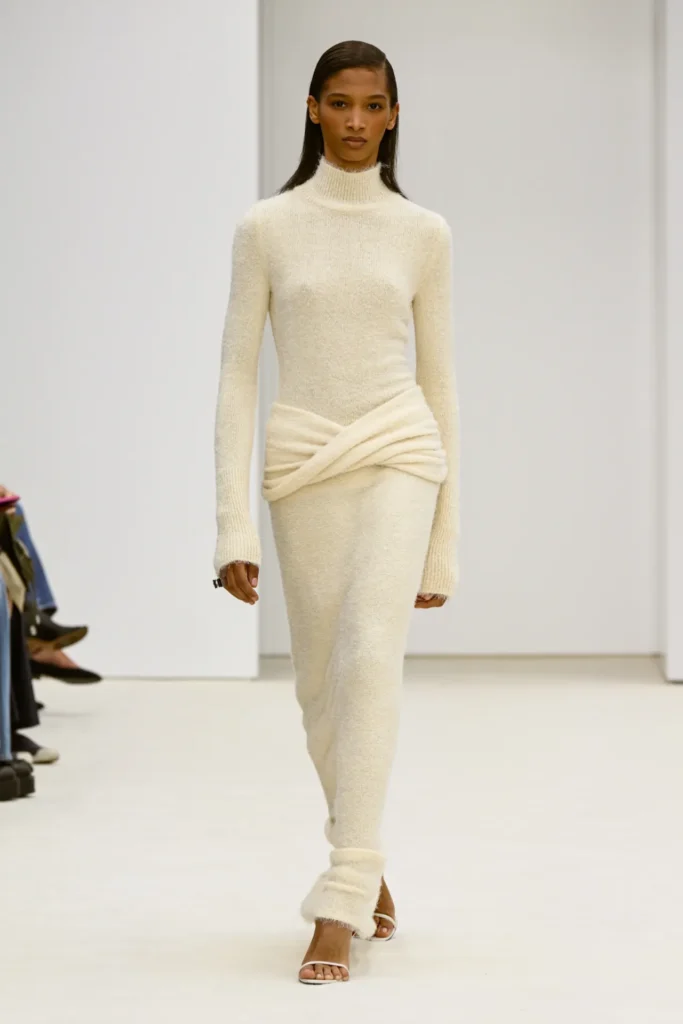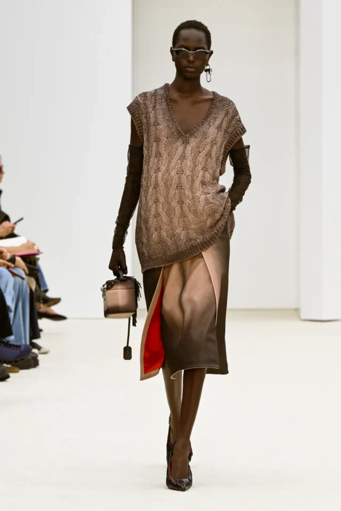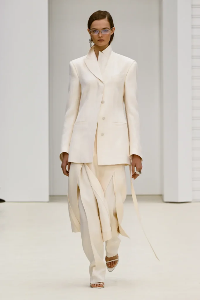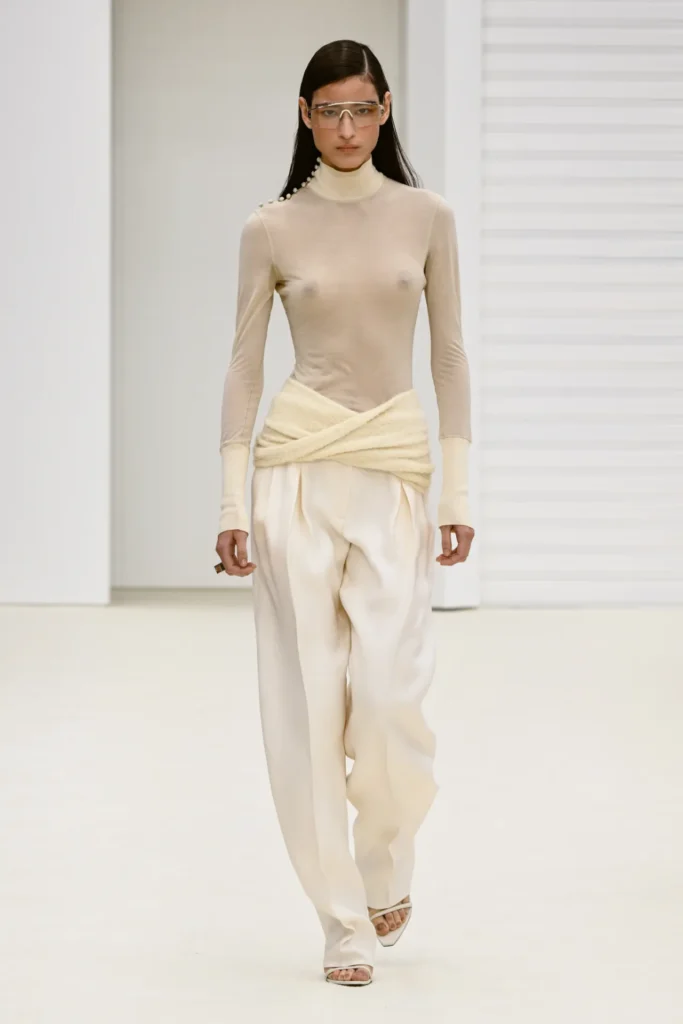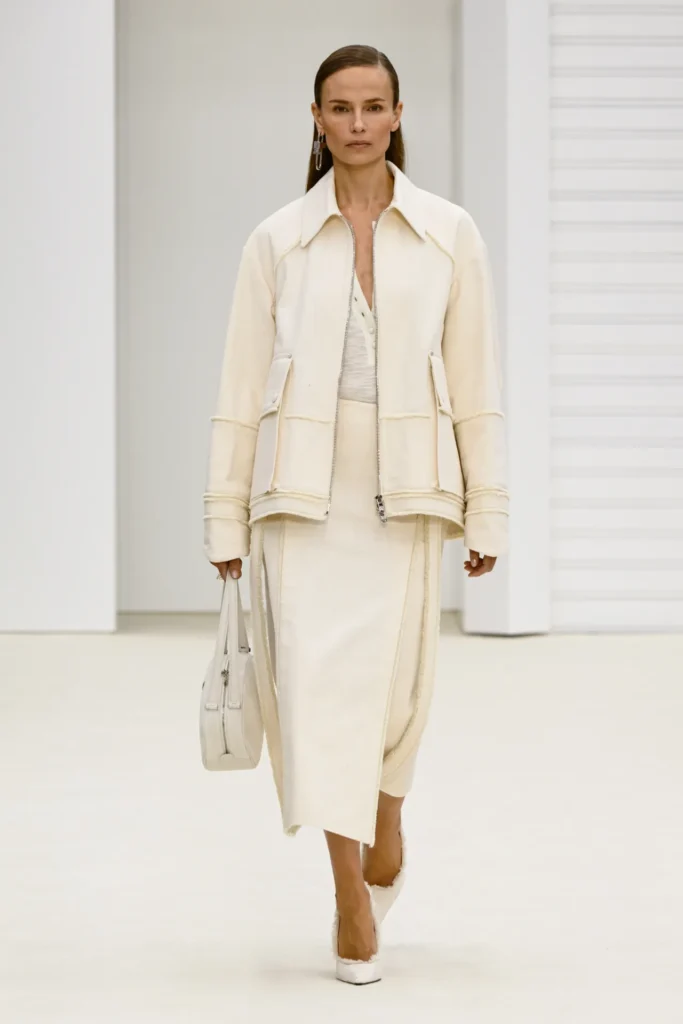 The show opened with relaxed tailoring, elongated dresses, and fluid shirts in shades of white ranging from buttery cream to optic, honoring the natural color of the yarns. Precision and serenity defined these pieces, with clean finishes and raw edges. Textile research played a starring role: delicate mesh knits, tailored trousers ideal for rainy days or seaside nights, and spongy leather pants paired with square bombers in oxidized or cocoa hues highlighted Iannone’s mastery of materials.