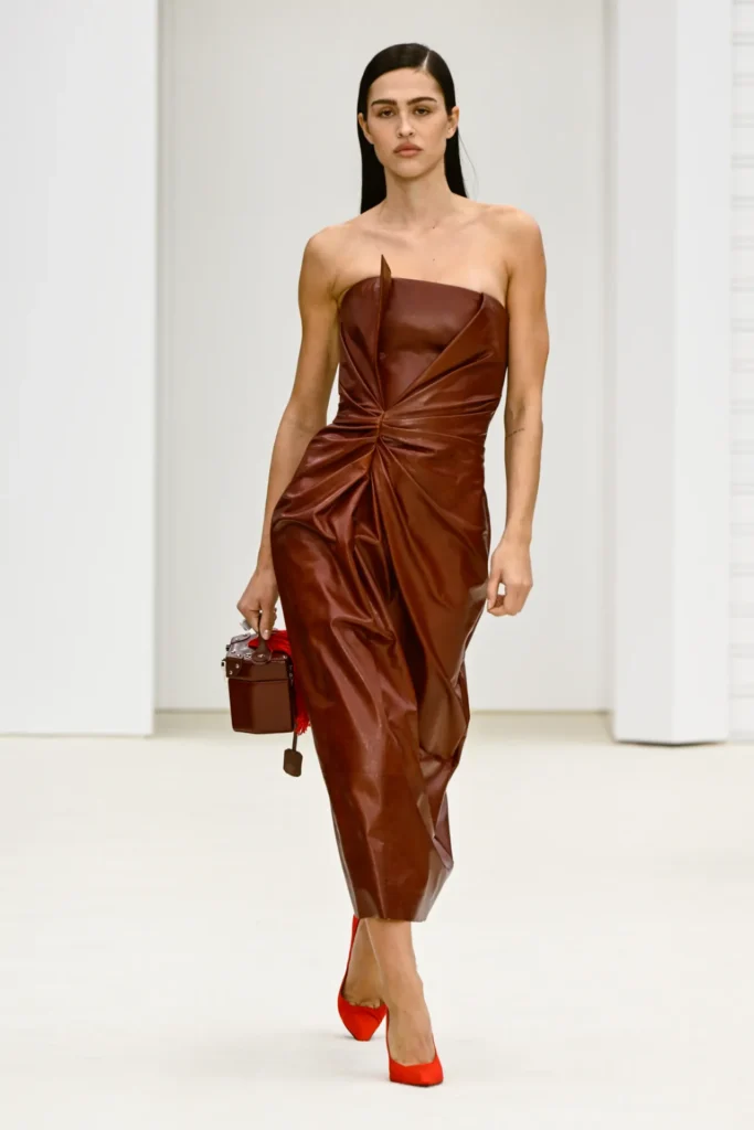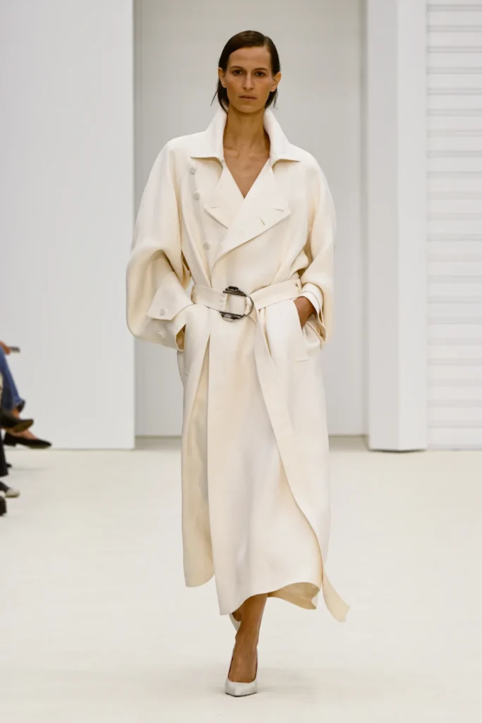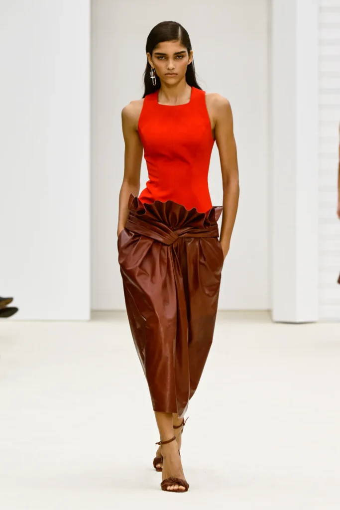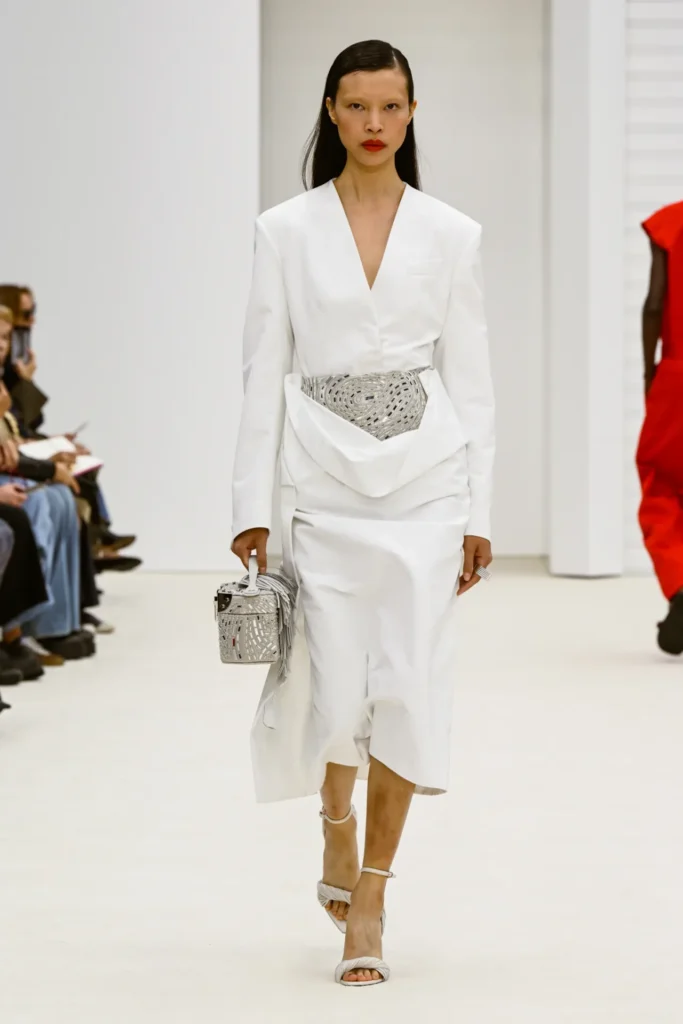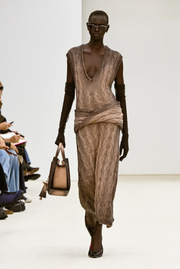 The show opened with relaxed tailoring, elongated dresses, and fluid shirts in shades of white ranging from buttery cream to optic, honoring the natural color of the yarns. Precision and serenity defined these pieces, with clean finishes and raw edges. Textile research played a starring role: delicate mesh knits, tailored trousers ideal for rainy days or seaside nights, and spongy leather pants paired with square bombers in oxidized or cocoa hues highlighted Iannone’s mastery of materials.