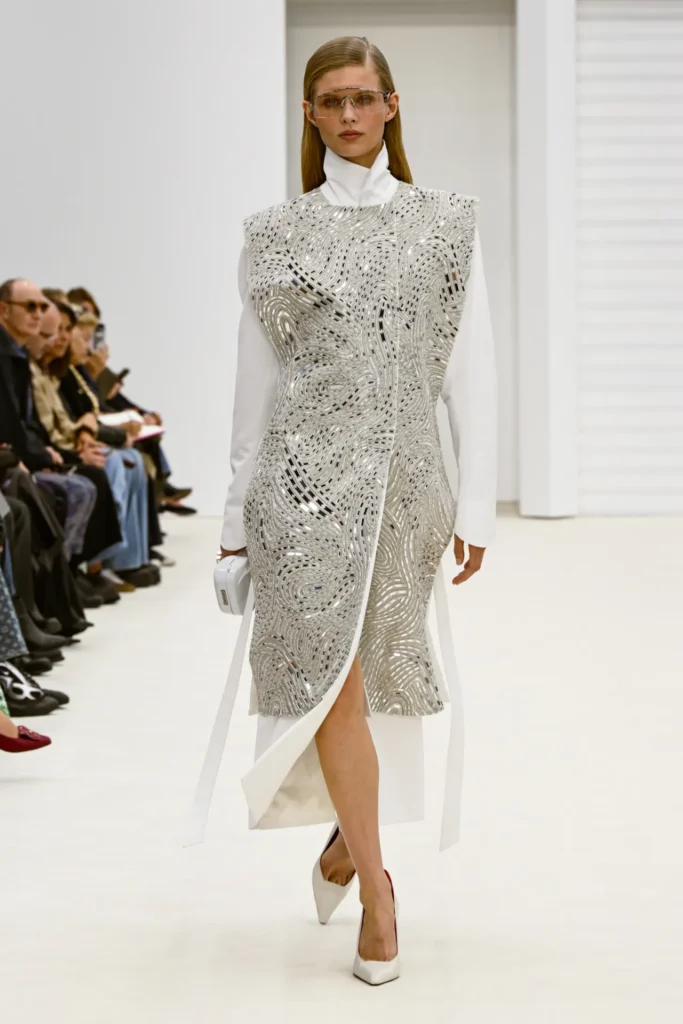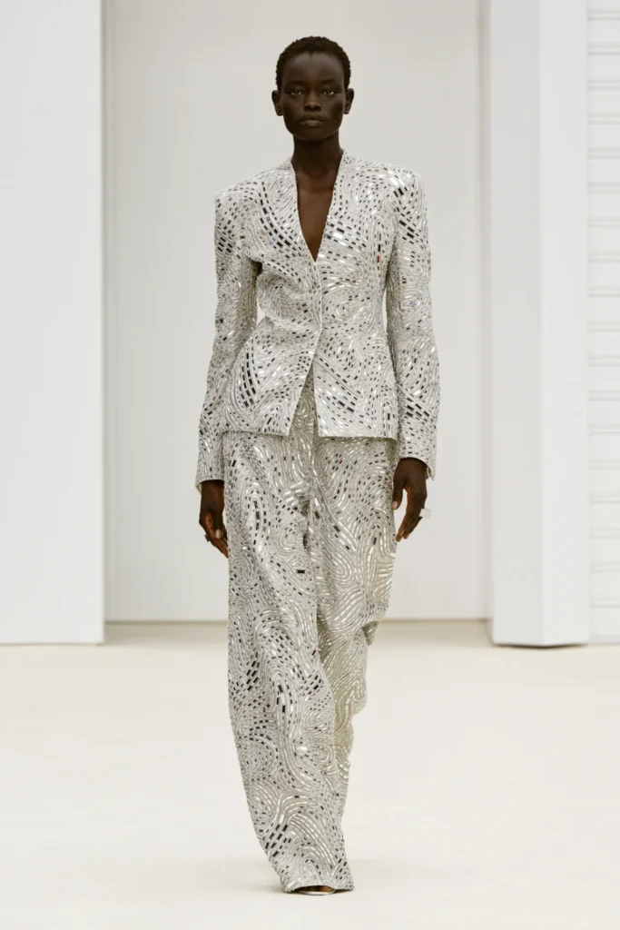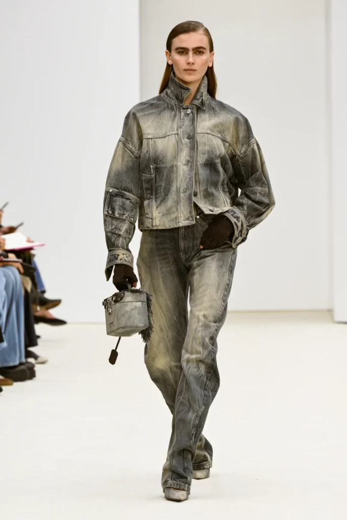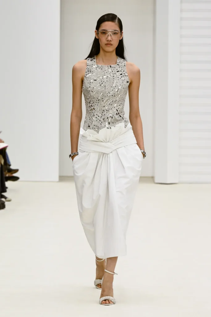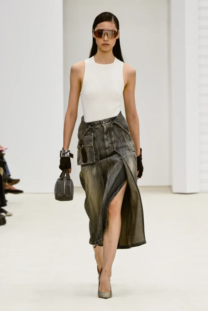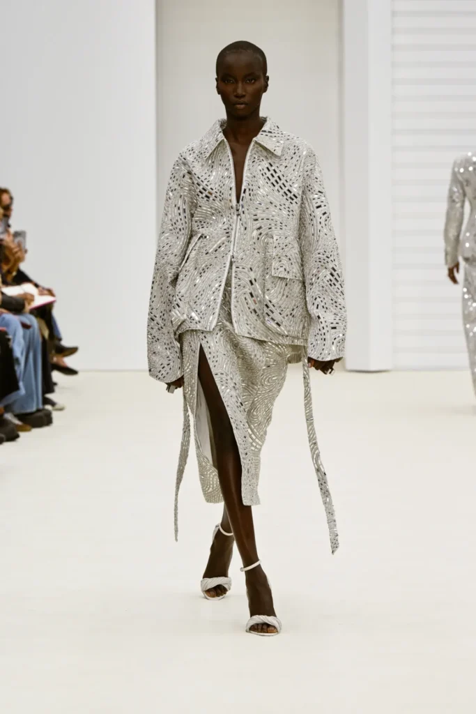 Structured yet supple leather molded to the body, while acid-washed denim skirts and cargo pants added a casual counterpoint. Menswear featured collarless jackets and drawstring trousers, underscoring a refined versatility. More elaborate touches appeared in hand-embroidered silk pieces, where shimmering graphics formed undulating patterns across skirts and tops.